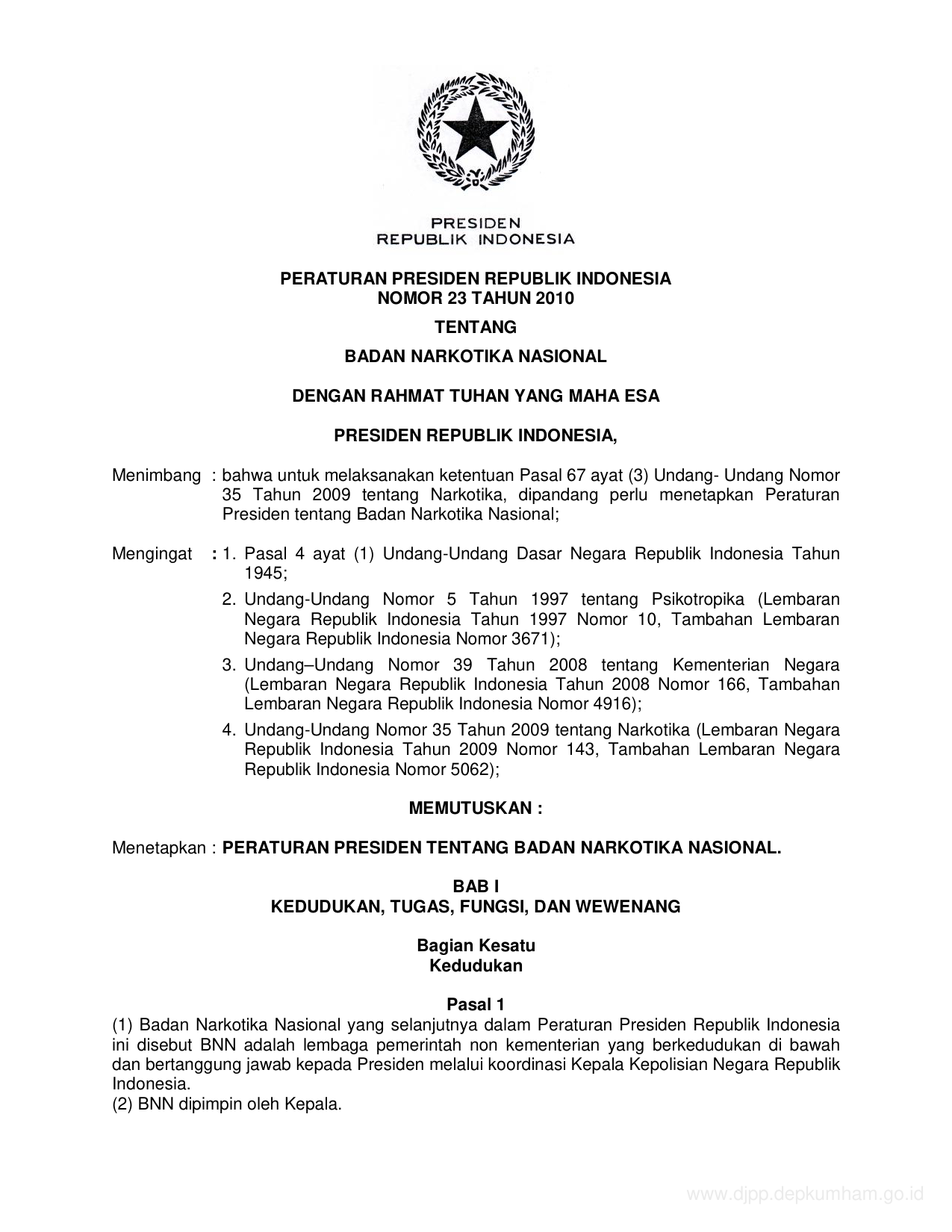 PERPRES Nomor 23 Tahun 2010 | Peraturan Presiden Nomor 23 Tahun 2010 tentang BADAN NARKOTIKA NASIONAL