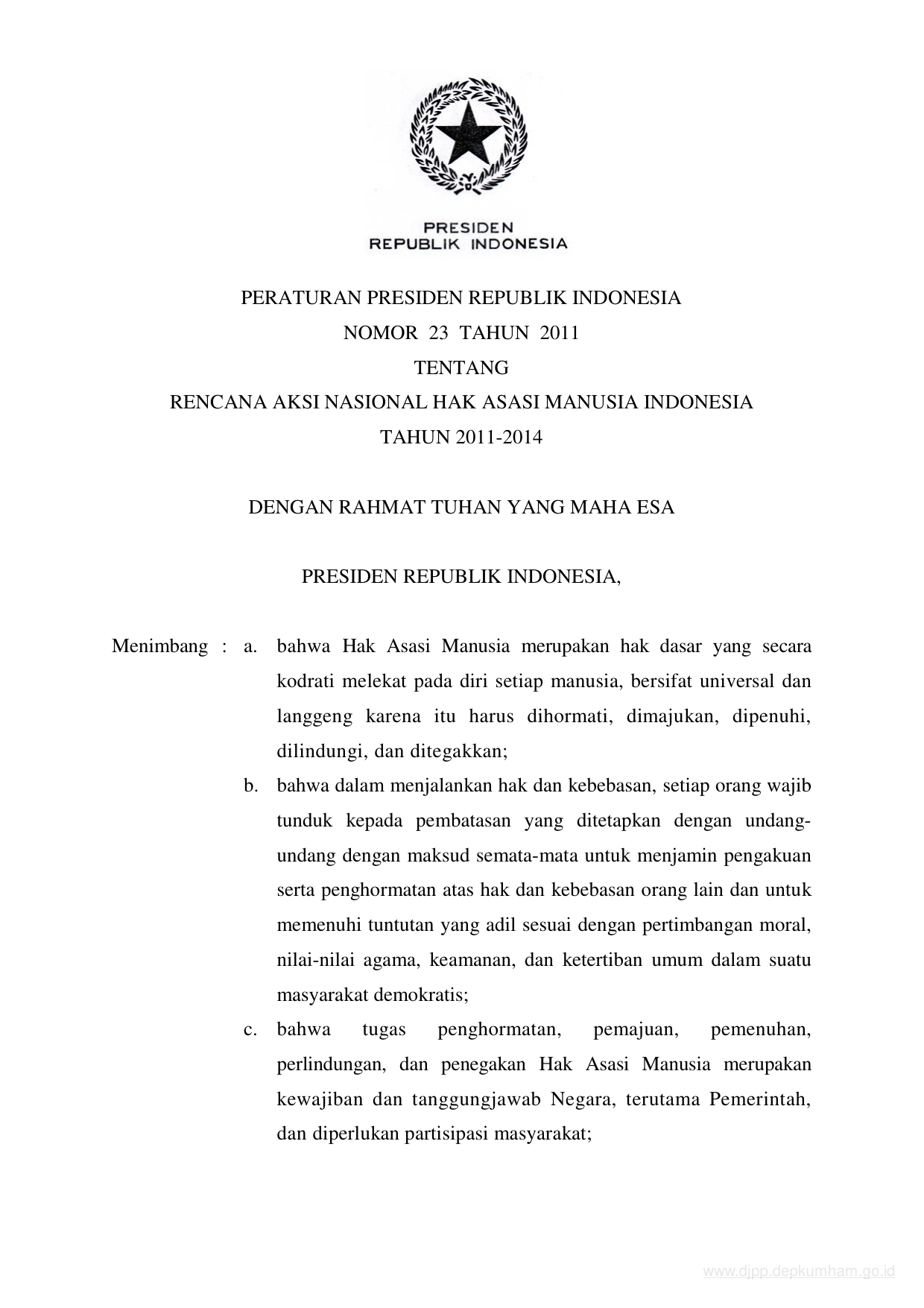 PERPRES Nomor 23 Tahun 2011 | Peraturan Presiden Nomor 23 Tahun 2011 tentang RENCANA AKSI NASIONAL HAK ASASI MANUSIA INDONESIA TAHUN 2011-2014