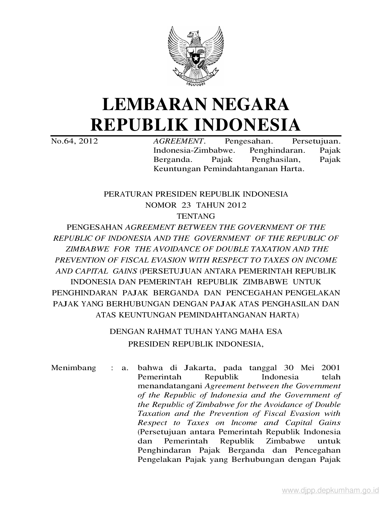 PERPRES Nomor 23 Tahun 2012 | Peraturan Presiden Nomor 23 Tahun 2012 tentang PENGESAHAN AGREEMENT BETWEEN THE GOVERNMENT OF THE REPUBLIC OF INDONESIA AND THE GOVERNMENT OF THE REPUBLIC OF ZIMBABWE FOR THE AVOIDANCE OF DOUBLE TAXATION AND THE PREVENTION OF FISCAL EVASION WITH RESPECT TO TAXES ON INCOME AND CAPITAL GAINS (PERSETUJUAN ANTARA PEMERINTAH REPUBLIK INDONESIA DAN PEMERINTAH REPUBLIK ZIMBABWE UNTUK PENGHINDARAN PAJAK BERGANDA DAN PENCEGAHAN PENGELAKAN PAJAK YANG BERHUBUNGAN DENGAN PAJAK ATAS PENGHASILAN DAN ATAS KEUNTUNGAN PEMINDAHTANGANAN HARTA)