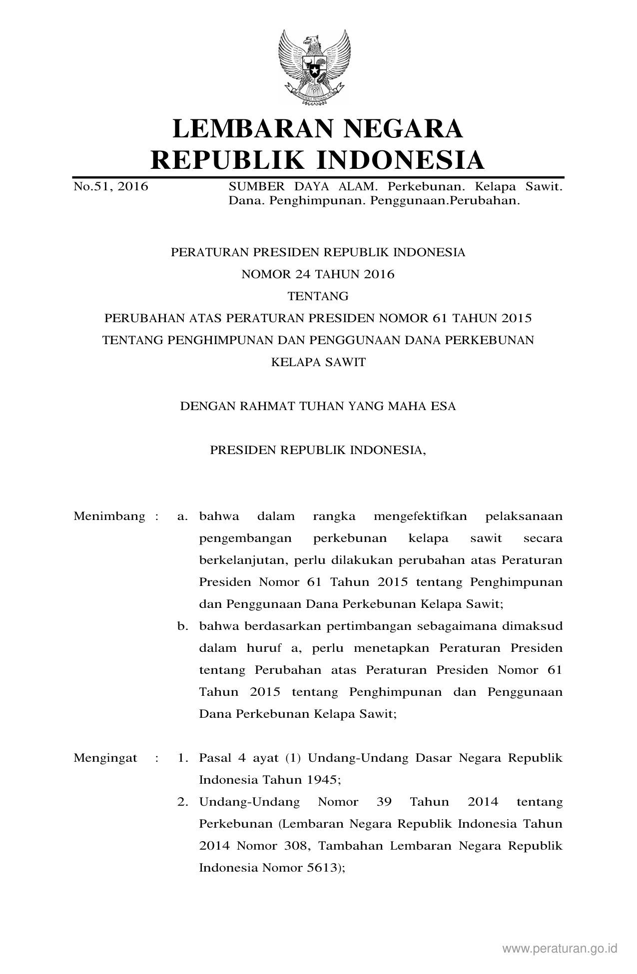 PERPRES Nomor 24 Tahun 2016 | Peraturan Presiden Nomor 24 Tahun 2016 tentang PERUBAHAN ATAS PERATURAN PRESIDEN NOMOR 61 TAHUN 2015 TENTANG PENGHIMPUNAN DAN PENGGUNAAN DANA PERKEBUNAN KELAPA SAWIT