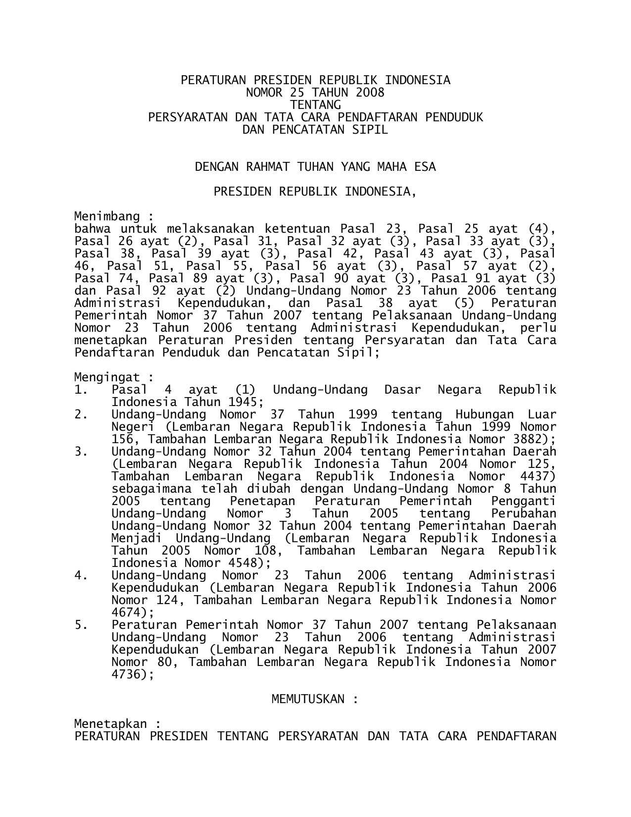PERPRES Nomor 25 Tahun 2008 | Peraturan Presiden Nomor 25 Tahun 2008 tentang PERSYARATAN DAN TATA CARA PENDAFTARAN PENDUDUK DAN PENCATATAN SIPIL