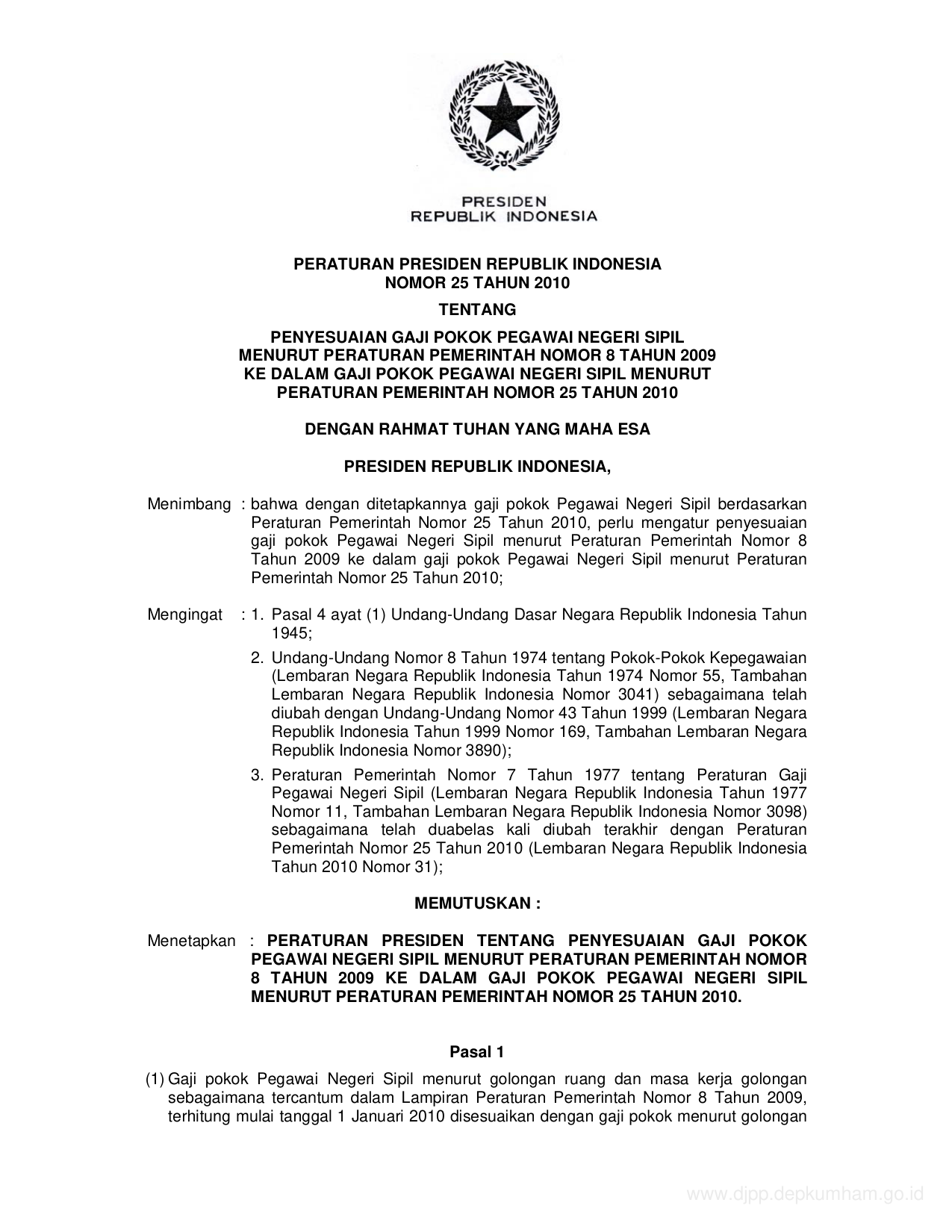 PERPRES Nomor 25 Tahun 2010 | Peraturan Presiden Nomor 25 Tahun 2010 tentang PENYESUAIAN GAJI POKOK PEGAWAI NEGERI SIPIL MENURUT PERATURAN PEMERINTAH NOMOR 8 TAHUN 2009 KE DALAM GAJI POKOK PEGAWAI NEGERI SIPIL MENURUT PERATURAN PEMERINTAH NOMOR 25 TAHUN 2010