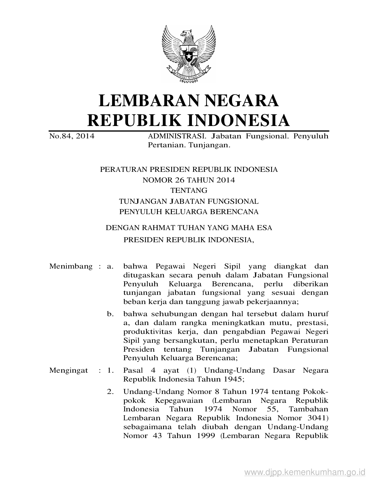 PERPRES Nomor 26 Tahun 2014 | Peraturan Presiden Nomor 26 Tahun 2014 tentang TUNJANGAN JABATAN FUNGSIONAL PENYULUH KELUARGA BERENCANA