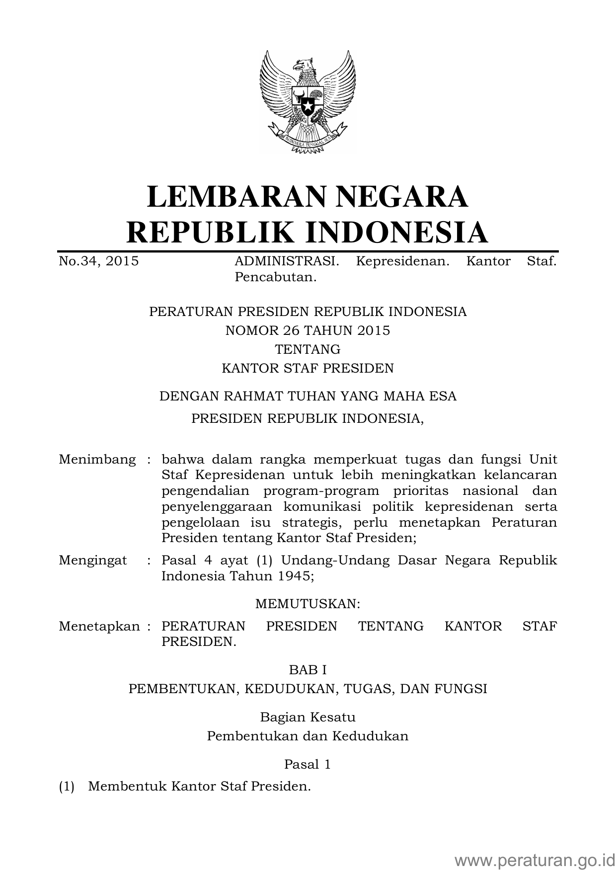 PERPRES Nomor 26 Tahun 2015 | Peraturan Presiden Nomor 26 Tahun 2015 tentang KANTOR STAF PRESIDEN
