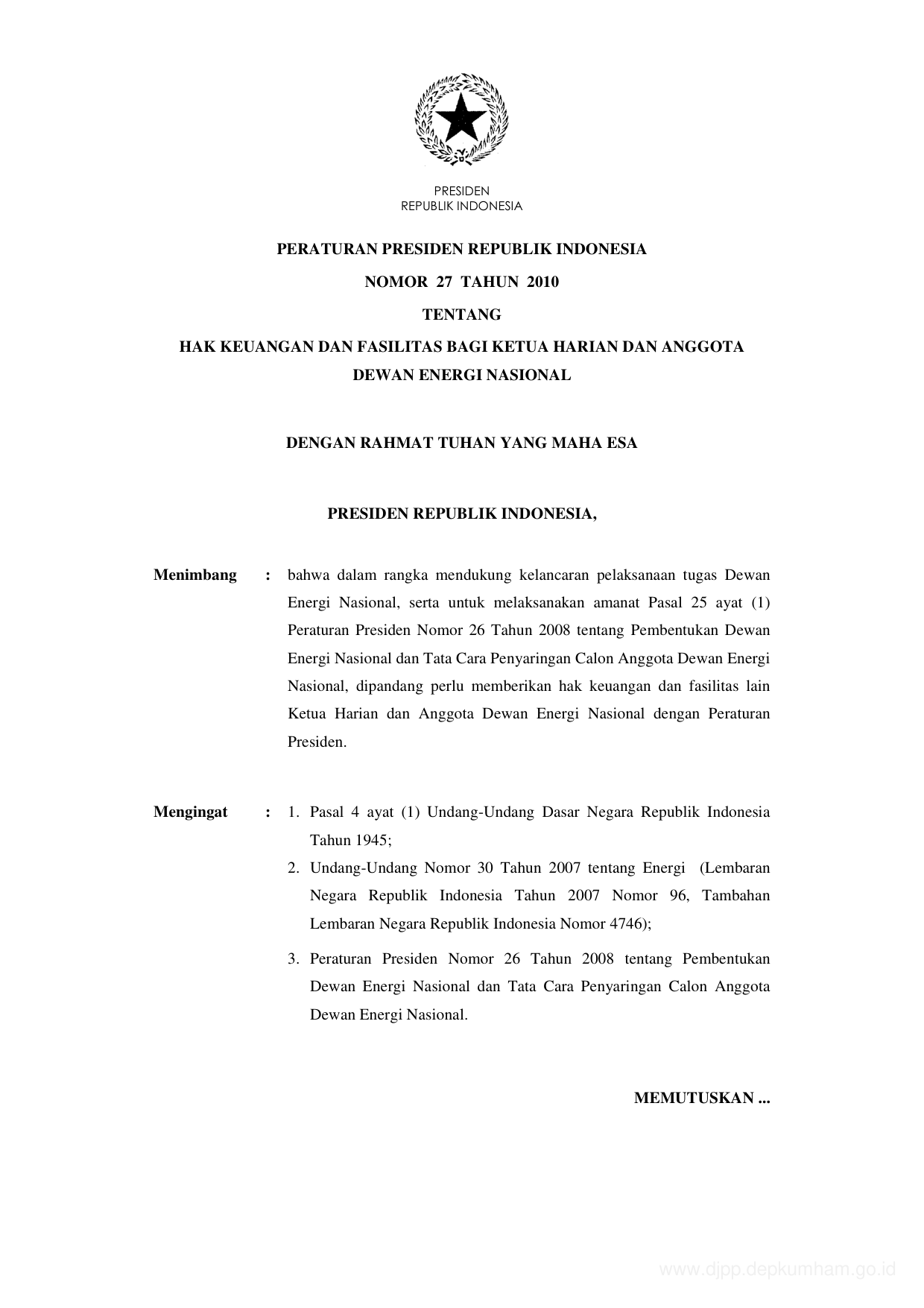 PERPRES Nomor 27 Tahun 2010 | Peraturan Presiden Nomor 27 Tahun 2010 tentang HAK KEUANGAN DAN FASILITAS BAGI KETUA HARIAN DAN ANGGOTA DEWAN ENERGI NASIONAL