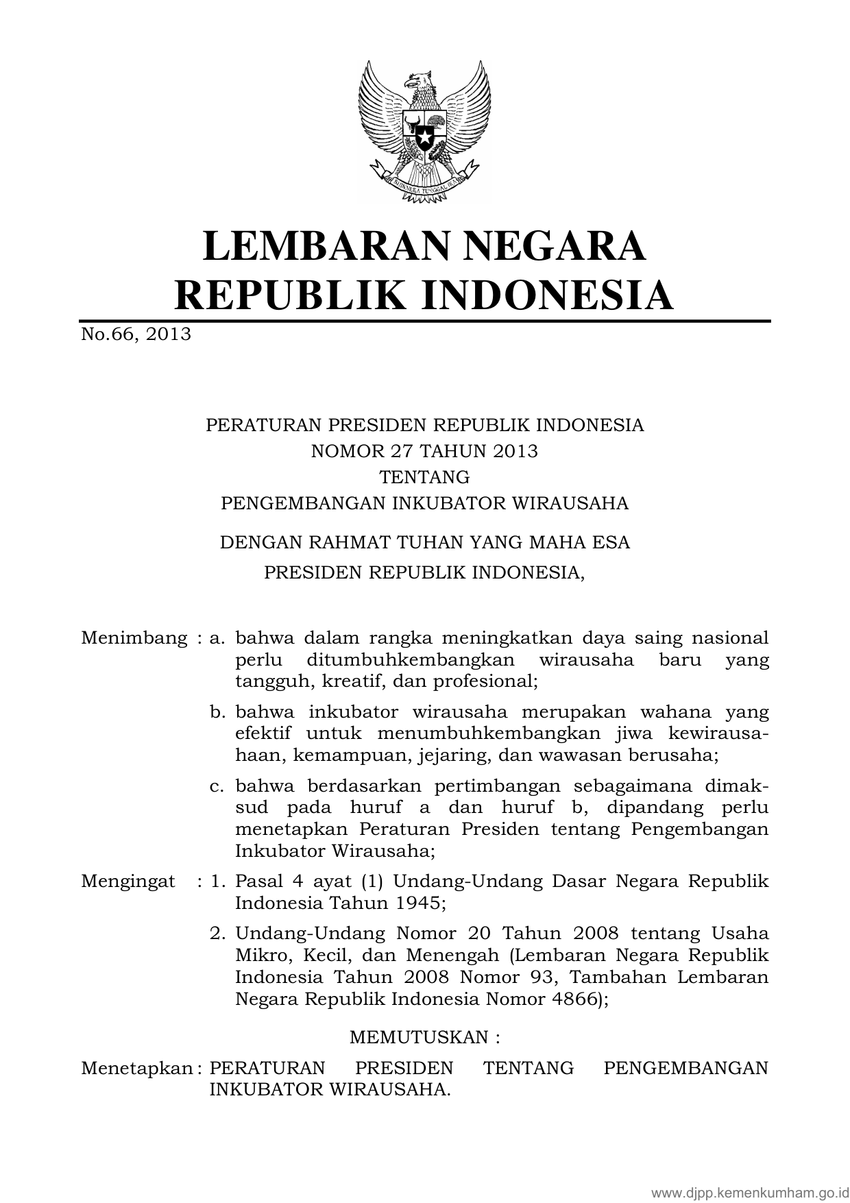PERPRES Nomor 27 Tahun 2013 | Peraturan Presiden Nomor 27 Tahun 2013 tentang PENGEMBANGAN INKUBATOR WIRAUSAHA