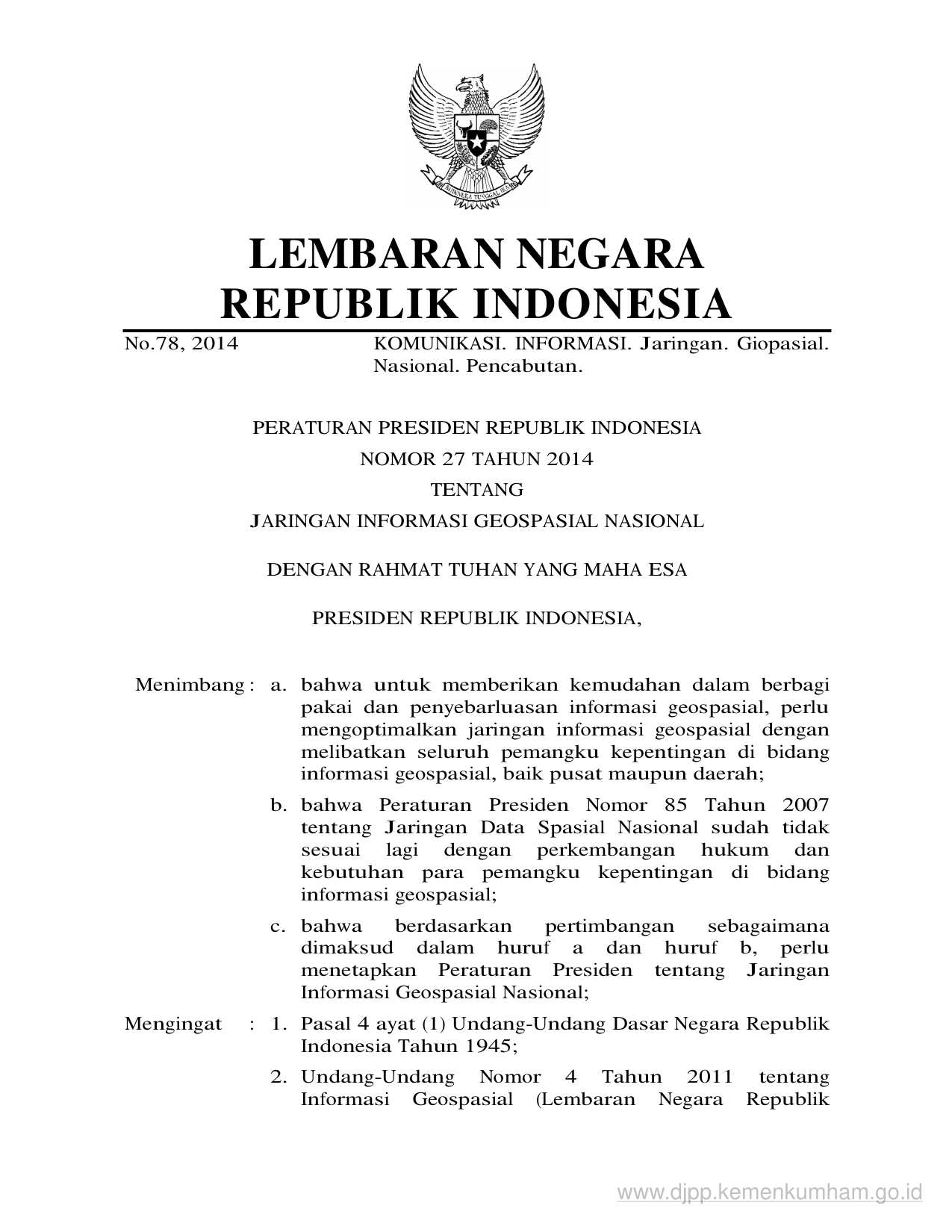 PERPRES Nomor 27 Tahun 2014 | Peraturan Presiden Nomor 27 Tahun 2014 tentang JARINGAN INFORMASI GEOSPASIAL NASIONAL