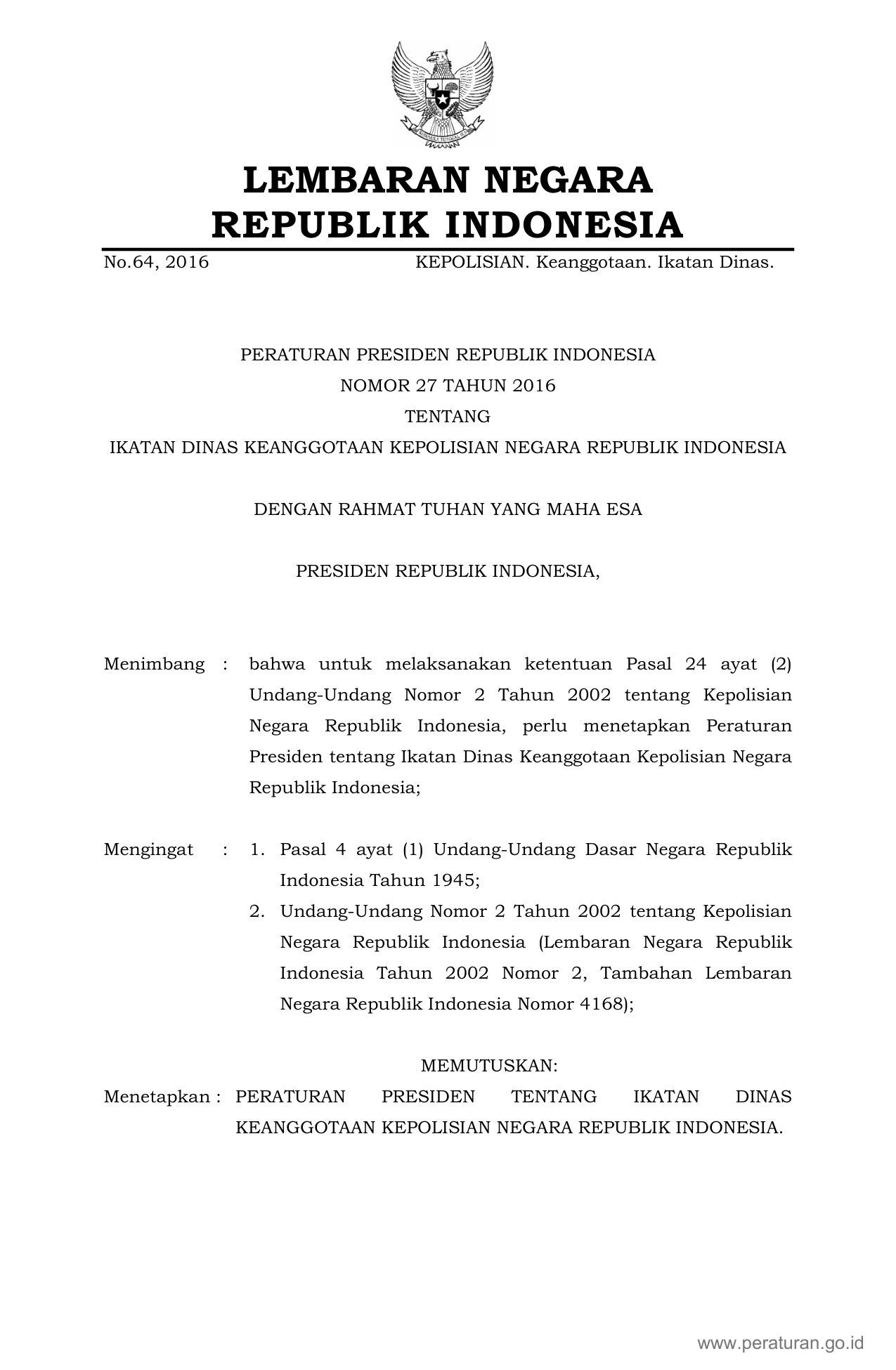 PERPRES Nomor 27 Tahun 2016 | Peraturan Presiden Nomor 27 Tahun 2016 tentang IKATAN DINAS KEANGGOTAAN KEPOLISIAN NEGARA REPUBLIK INDONESIA