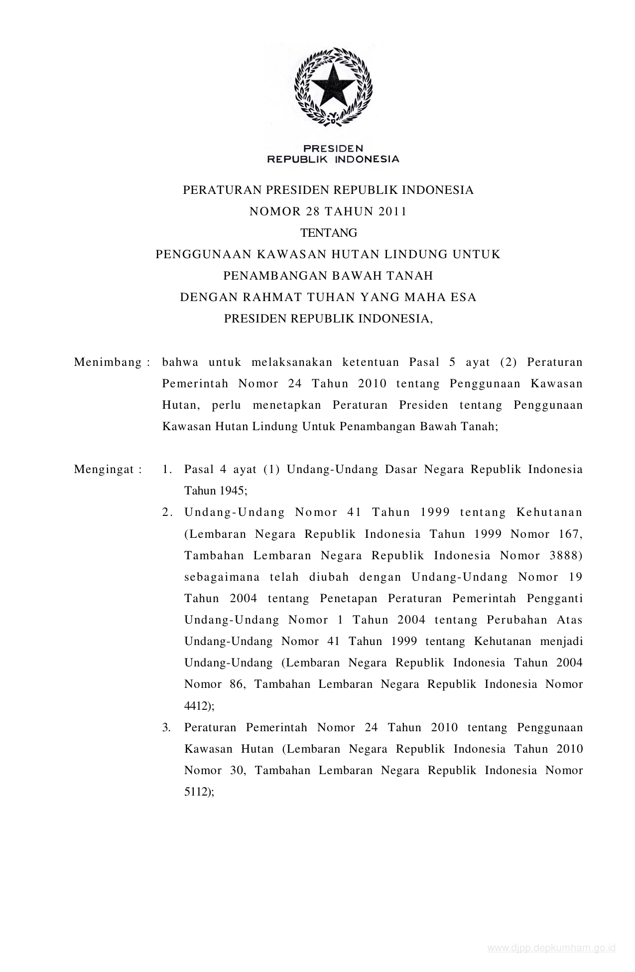 PERPRES Nomor 28 Tahun 2011 | Peraturan Presiden Nomor 28 Tahun 2011 tentang PENGGUNAAN KAWASAN HUTAN LINDUNG UNTUK PENAMBANGAN BAWAH TANAH