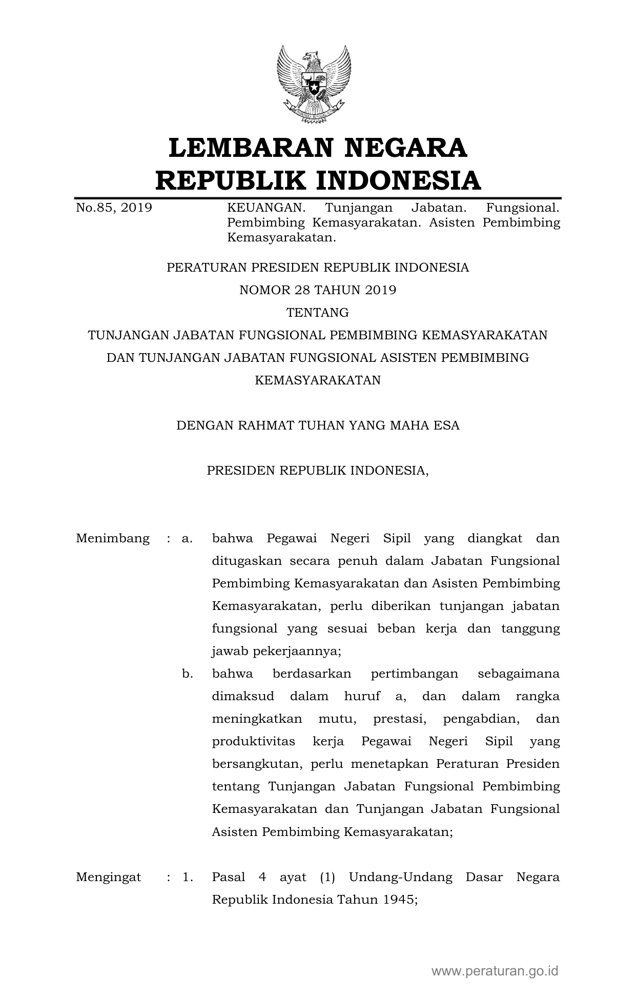 PERPRES Nomor 28 Tahun 2019 | Peraturan Presiden Nomor 28 Tahun 2019 tentang TUNJANGAN JABATAN FUNGSIONAL PEMBIMBING KEMASYARAKATAN DAN TUNJANGAN JABATAN FUNGSIONAL ASISTEN PEMBIMBING KEMASYARAKATAN