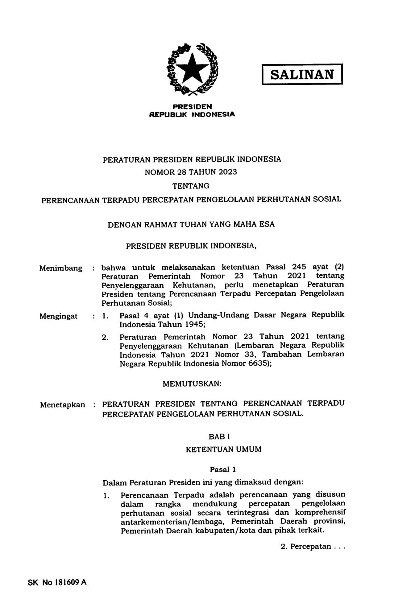 PERPRES Nomor 28 Tahun 2023 | Peraturan Presiden Nomor 28 Tahun 2023 tentang PERENCANAAN TERPADU PERCEPATAN PENGELOLAAN PERHUTANAN SOSIAL
