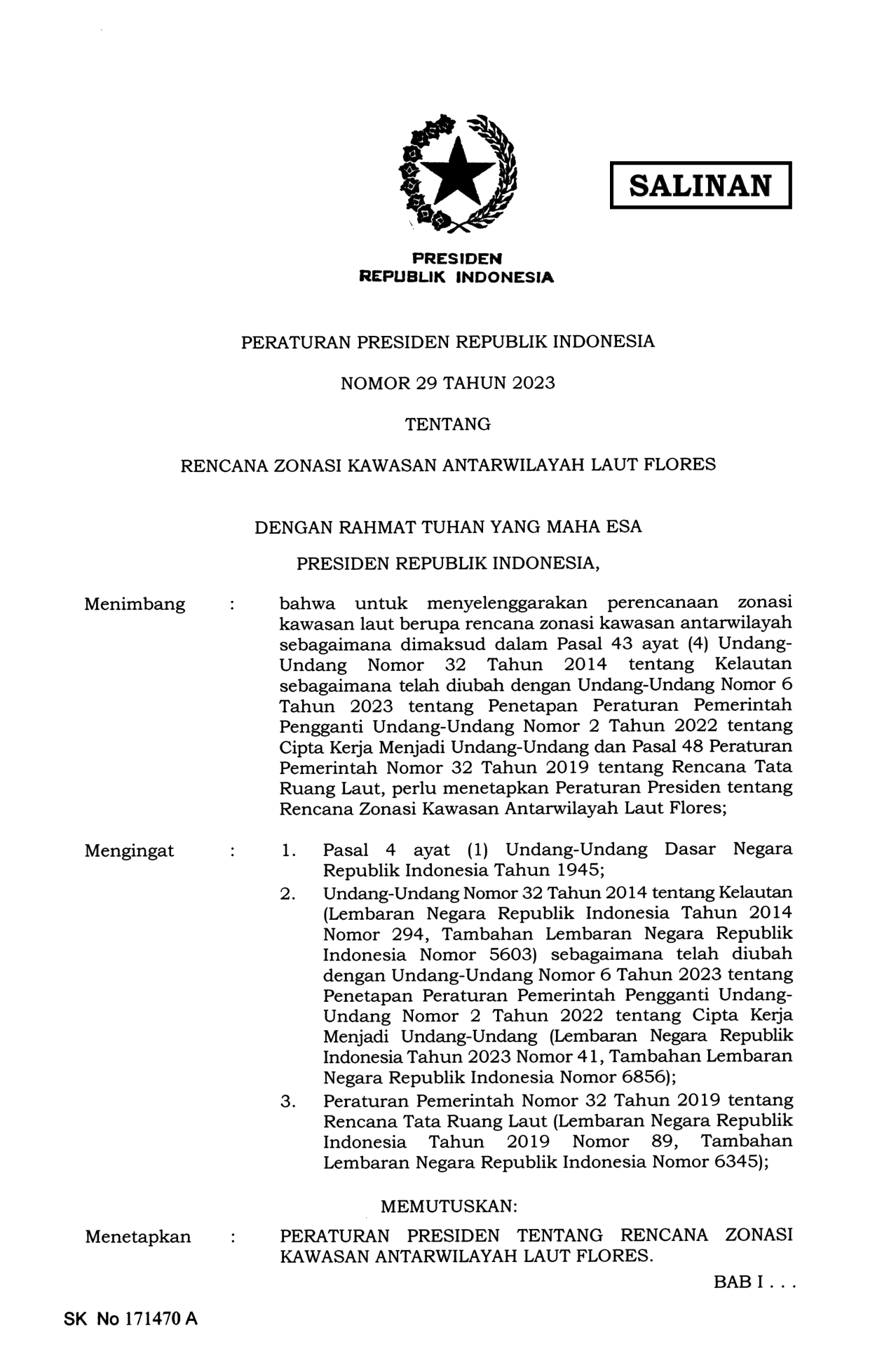 PERPRES Nomor 29 Tahun 2023 | Peraturan Presiden Nomor 29 Tahun 2023 tentang RENCANA ZONASI KAWASAN ANTARWILAYAH LAUT FLORES