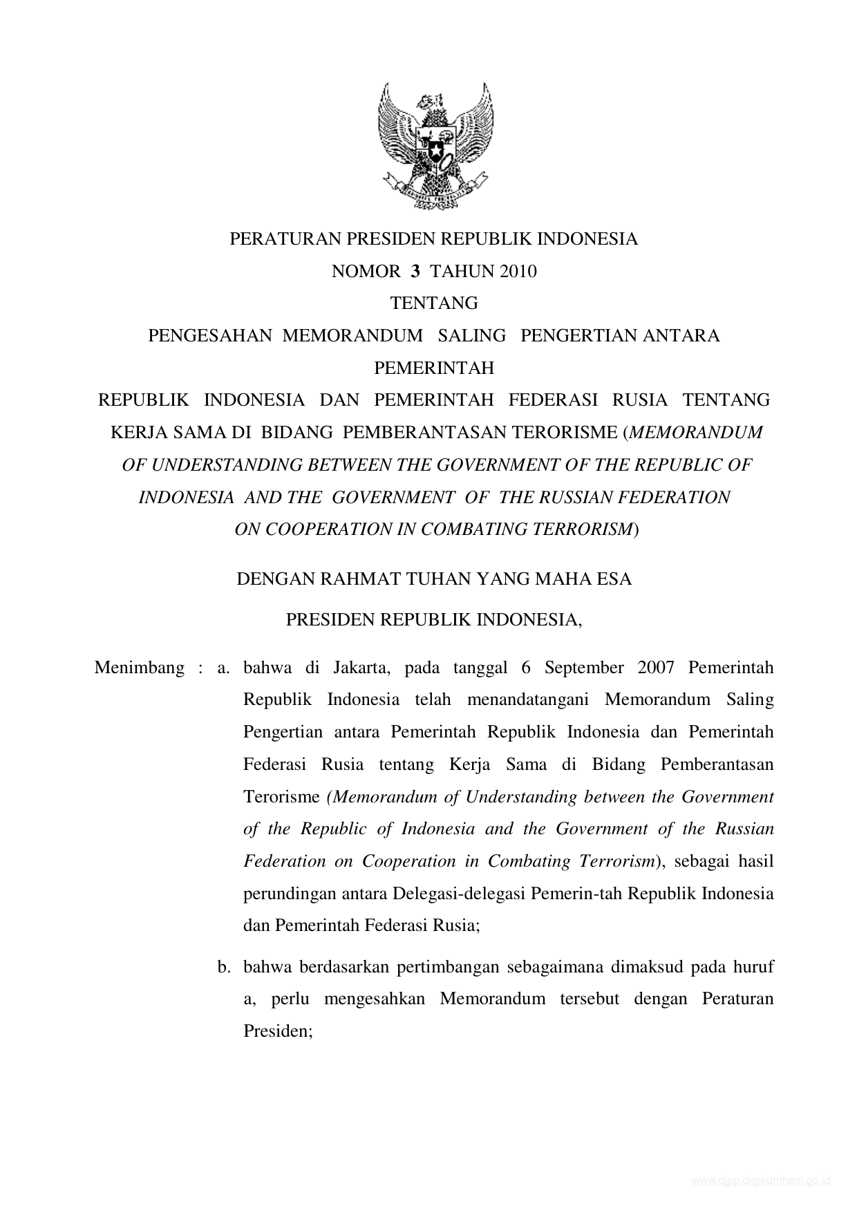 PERPRES Nomor 3 Tahun 2010 | Peraturan Presiden Nomor 3 Tahun 2010 tentang PENGESAHAN MEMORANDUM SALING PENGERTIAN ANTARA PEMERINTAH REPUBLIK INDONESIA DAN PEMERINTAH FEDERASI RUSIA TENTANG KERJA SAMA DI BIDANG PEMBERANTASAN TERORISME (MEMORANDUM OF UNDERSTANDING BETWEEN THE GOVERNMENT OF THE REPUBLIC OF INDONESIA AND THE GOVERNMENT OF THE RUSSIAN FEDERATION ON COOPERATION IN COMBATING TERORISM)