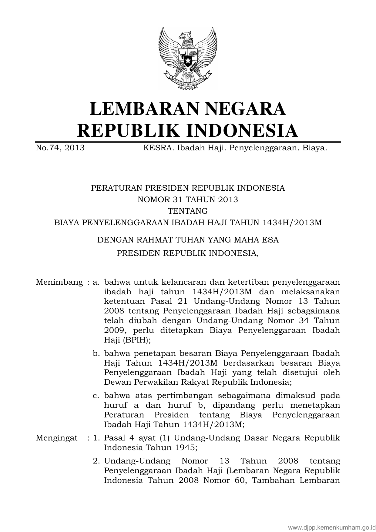PERPRES Nomor 31 Tahun 2013 | Peraturan Presiden Nomor 31 Tahun 2013 tentang BIAYA PENYELENGGARAAN IBADAH HAJI TAHUN 1434H/2013M