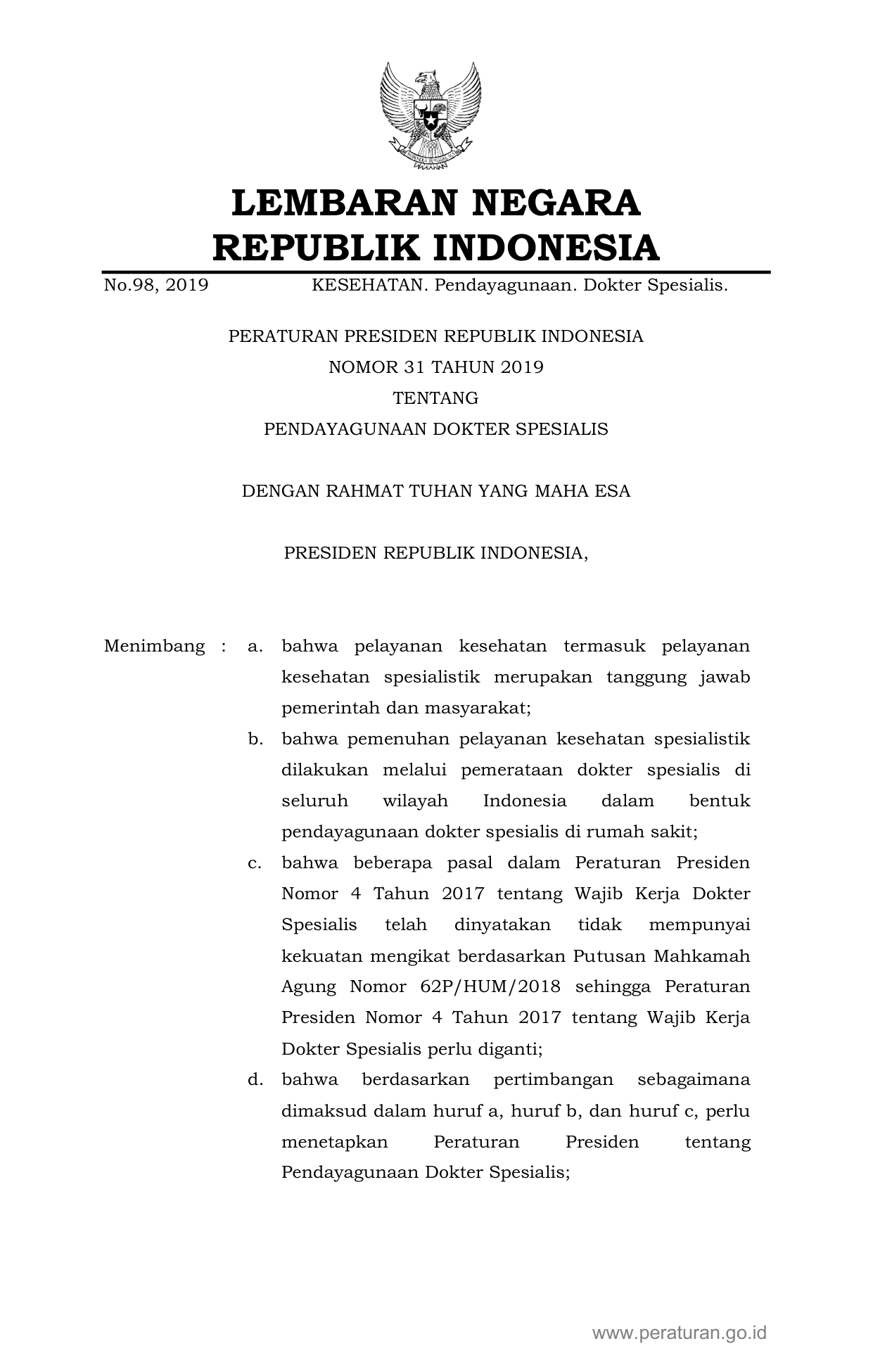 PERPRES Nomor 31 Tahun 2019 | Peraturan Presiden Nomor 31 Tahun 2019 tentang PENDAYAGUNAAN DOKTER SPESIALIS