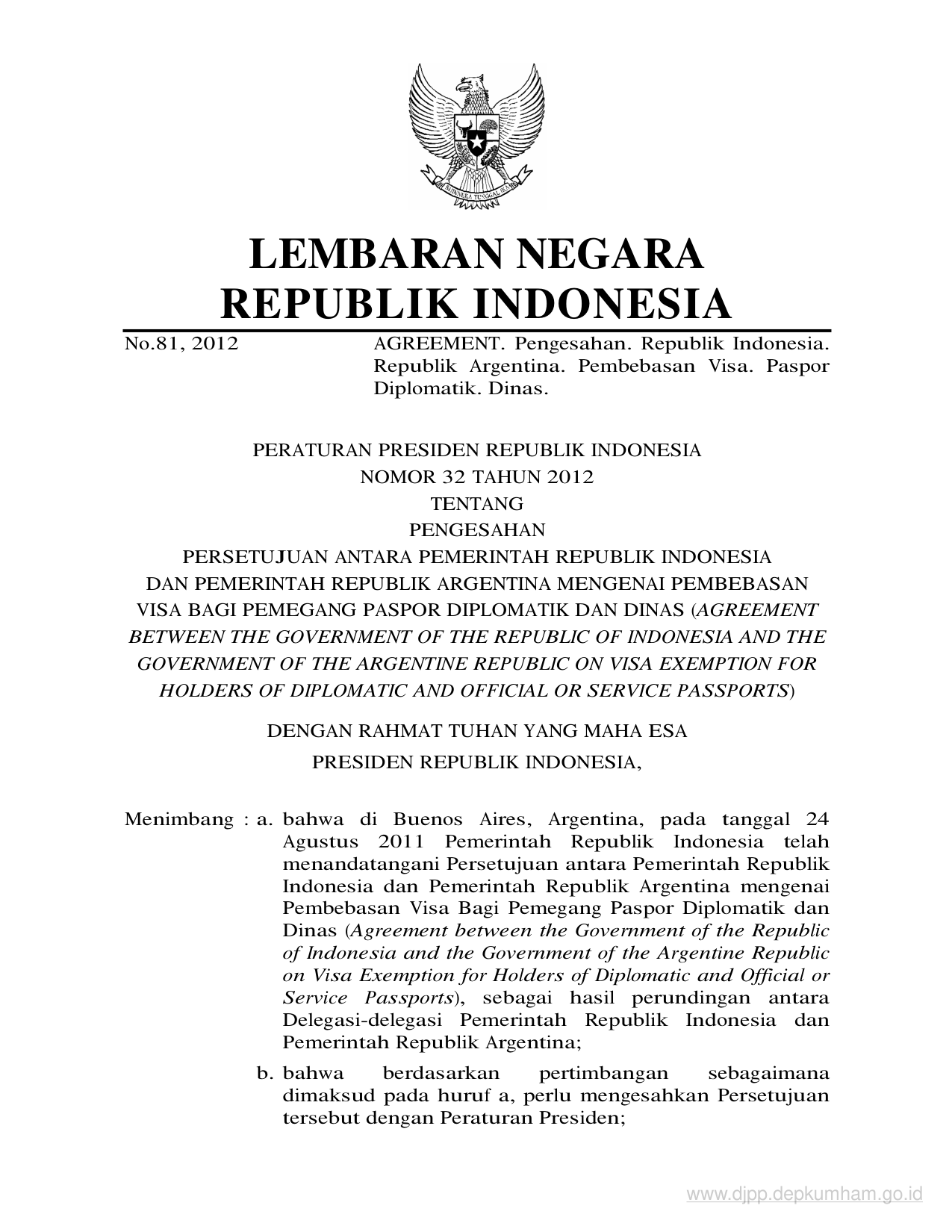 PERPRES Nomor 32 Tahun 2012 | Peraturan Presiden Nomor 32 Tahun 2012 tentang PENGESAHAN PERSETUJUAN ANTARA PEMERINTAH REPUBLIK INDONESIA DAN PEMERINTAH REPUBLIK ARGENTINA MENGENAI PEMBEBASAN VISA BAGI PEMEGANG PASPOR DIPLOMATIK DAN DINAS (AGREEMENT BETWEEN THE GOVERNMENT OF THE REPUBLIC OF INDONESIA AN D THE GOVERNMENT OF THE ARGENTINE REPUBLIC ON VISA EXEMPTION FOR HOLDERS OF DIPLOMATIC AND OFFICIAL OR SERVICE PASSPORTS)