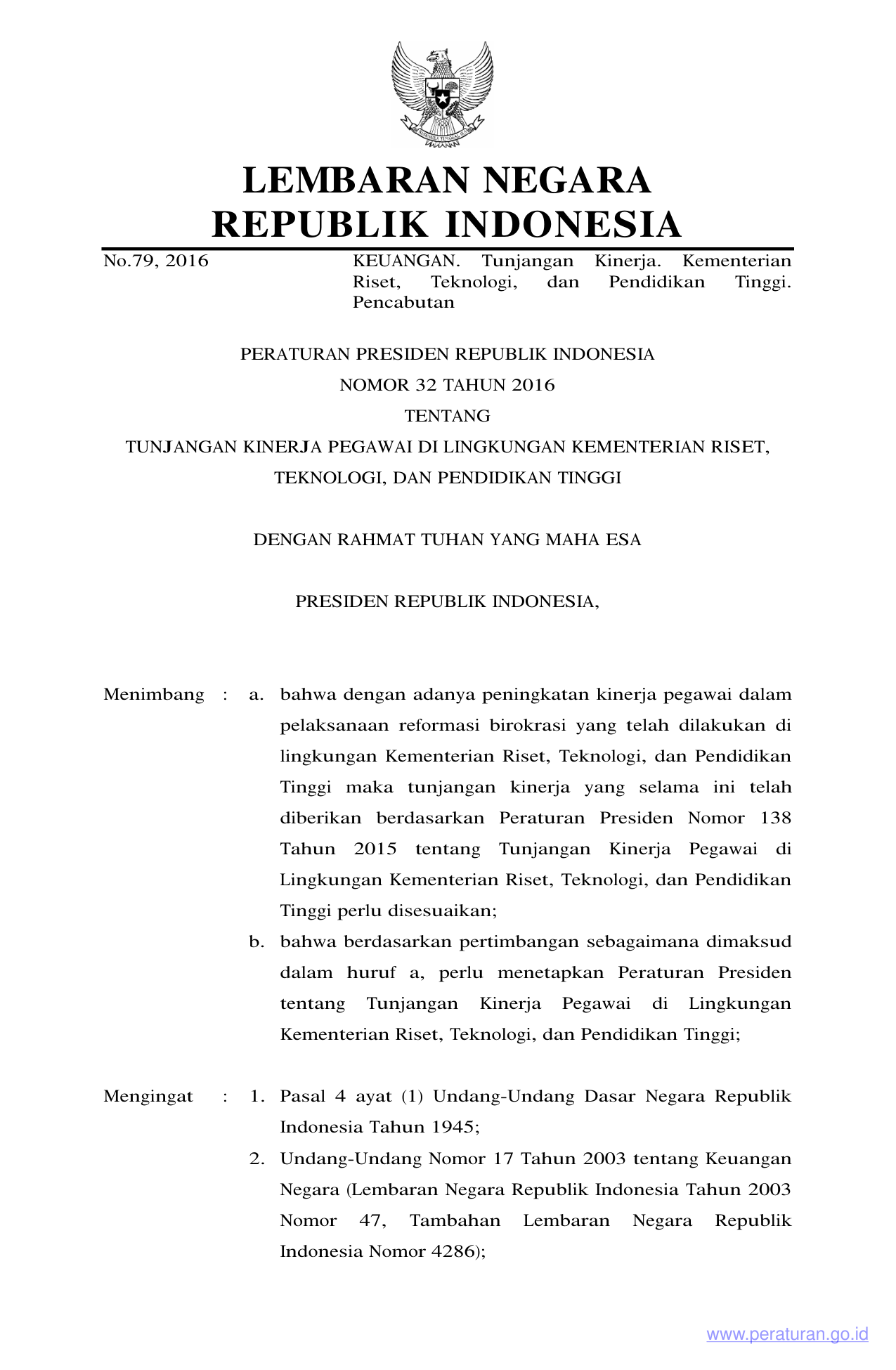 PERPRES Nomor 32 Tahun 2016 | Peraturan Presiden Nomor 32 Tahun 2016 tentang TUNJANGAN KINERJA PEGAWAI DI LINGKUNGAN KEMENTERIAN RISET TEKNOLOGI DAN PENDIDIKAN TINGGI