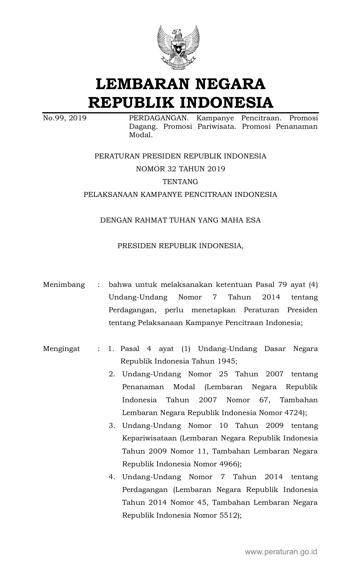 PERPRES Nomor 32 Tahun 2019 | Peraturan Presiden Nomor 32 Tahun 2019 tentang PELAKSANAAN KAMPANYE PENCITRAAN INDONESIA