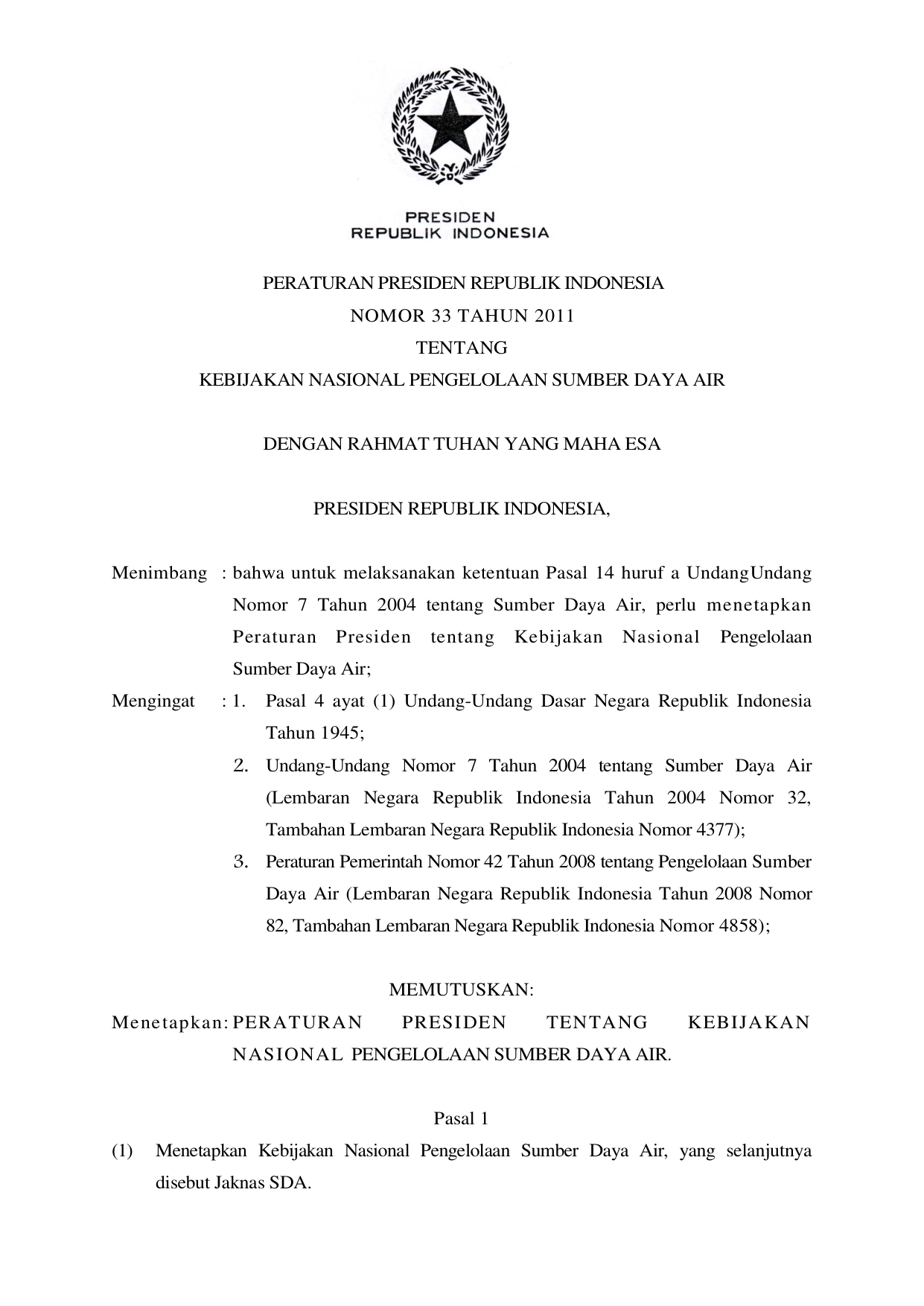 PERPRES Nomor 33 Tahun 2011 | Peraturan Presiden Nomor 33 Tahun 2011 tentang KEBIJAKAN NASIONAL PENGELOLAAN SUMBER DAYA AIR