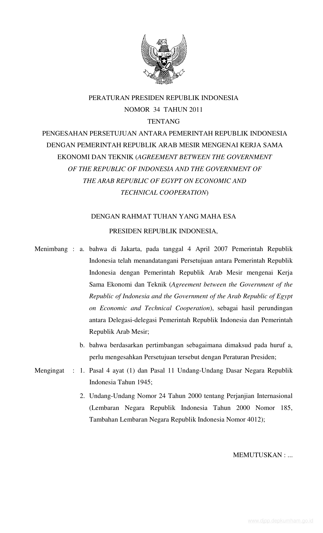 PERPRES Nomor 34 Tahun 2011 | Peraturan Presiden Nomor 34 Tahun 2011 tentang PENGESAHAN PERSETUJUAN ANTARA PEMERINTAH REPUBLIK INDONESIA DENGAN PEMERINTAH REPUBLIK ARAB MESIR MENGENAI KERJA SAMA EKONOMI DAN TEKNIK (AGREEMENT BETWEEN THE GOVERNMENT OF THE REPUBLIC OF INDONESIA AND THE GOVERNMENT OF THE ARAB REPUBLIC OF EGYPT ON ECONOMIC AND TECHNICAL COOPERATION)