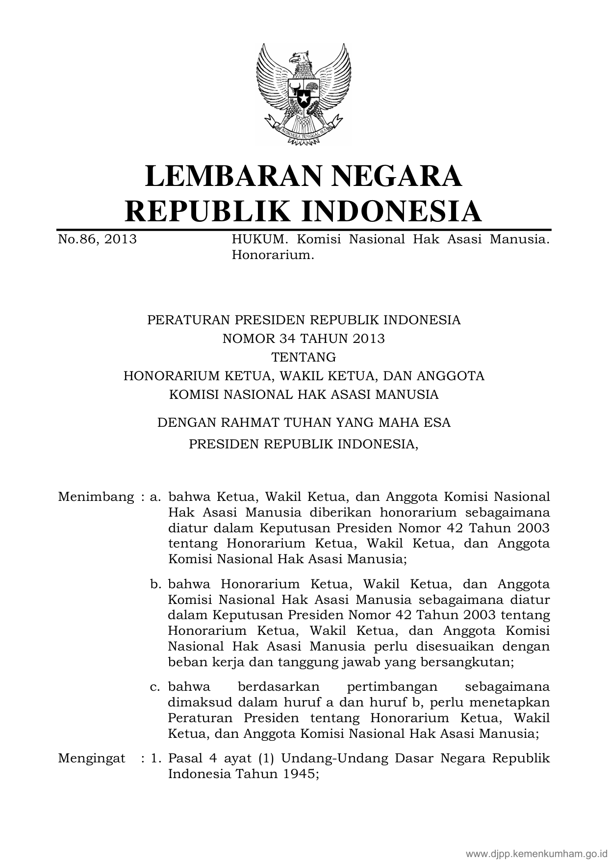 PERPRES Nomor 34 Tahun 2013 | Peraturan Presiden Nomor 34 Tahun 2013 tentang HONORARIUM KETUA, WAKIL KETUA, DAN ANGGOTA KOMISI NASIONAL HAK ASASI MANUSIA