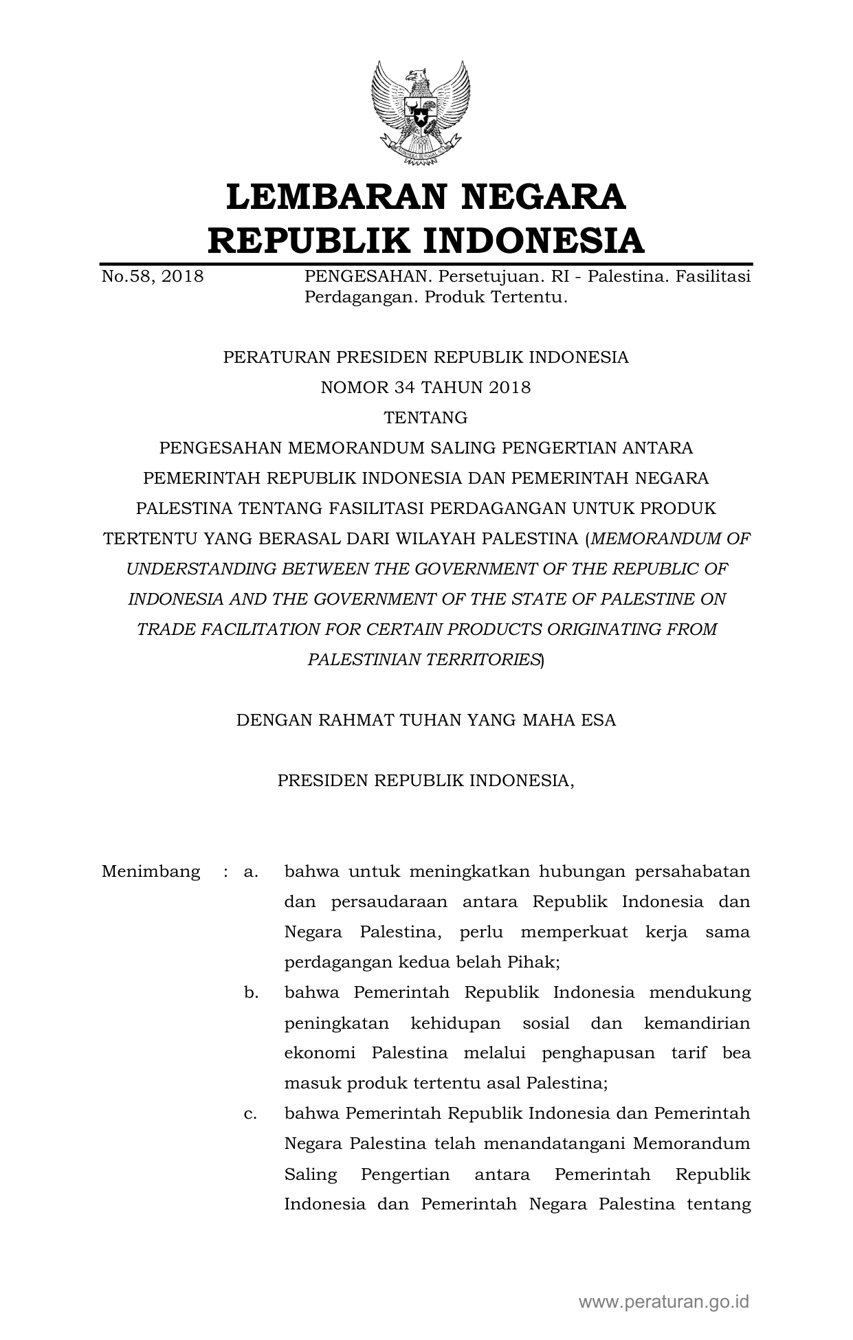 PERPRES Nomor 34 Tahun 2018 | Peraturan Presiden Nomor 34 Tahun 2018 tentang Pengesahan Memorandum Saling Pengertian Antara Pemerintah Republik Indonesia dan Pemerintah Negara Palestina tentang Fasilitasi Perdagangan untuk Produk Tertentu yang Berasal dari Wilayah Palestina (Memorandum of Understanding Between The Government of The Republic of Indonesia and The Government of The State of Palestine on Trade Facilitation for Certain Products Originating From Palestinian Territories)