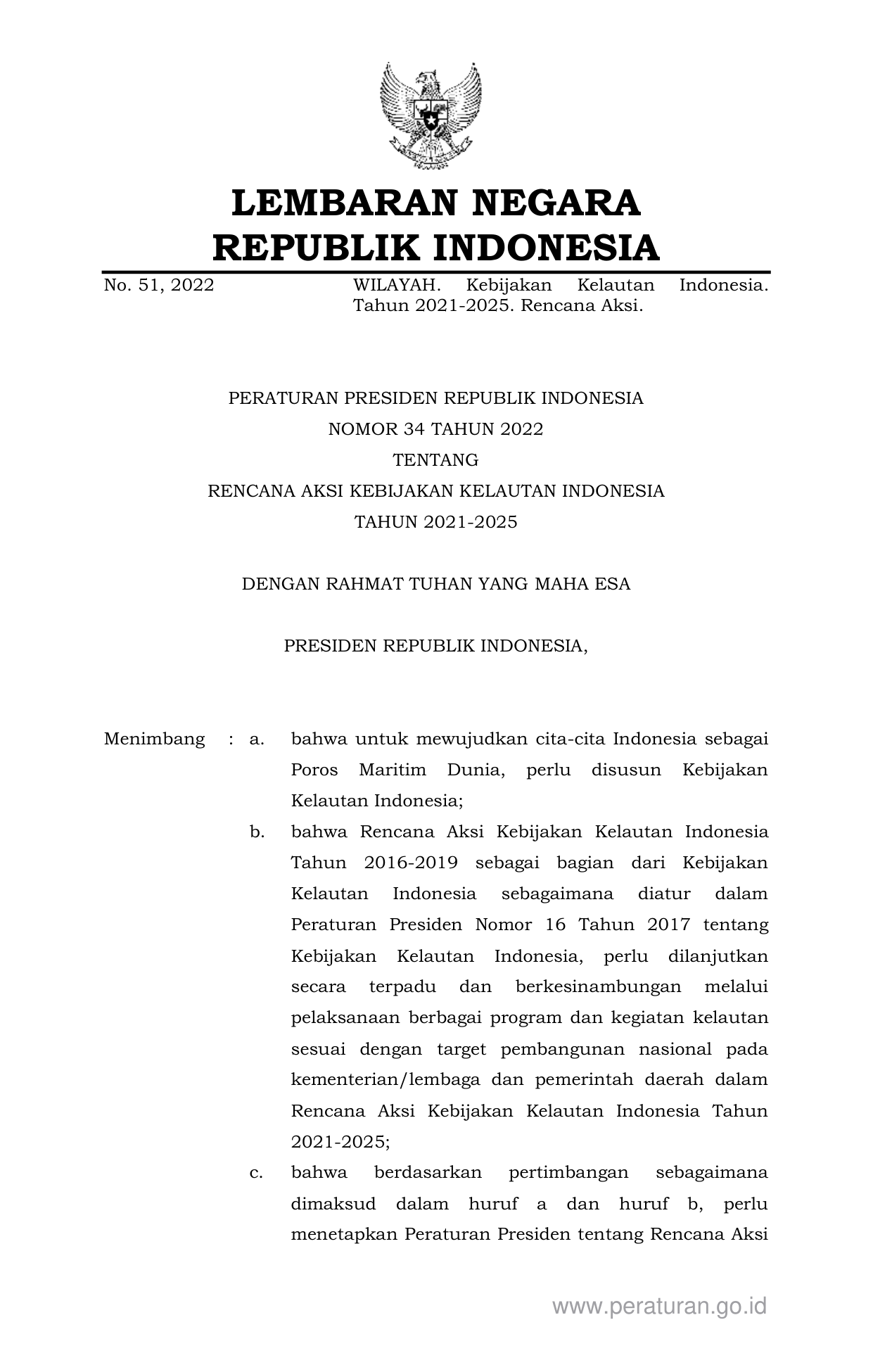 PERPRES Nomor 34 Tahun 2022 | Peraturan Presiden Nomor 34 Tahun 2022 tentang RENCANA AKSI KEBIJAKAN KELAUTAN INDONESIA TAHUN 2021-2025