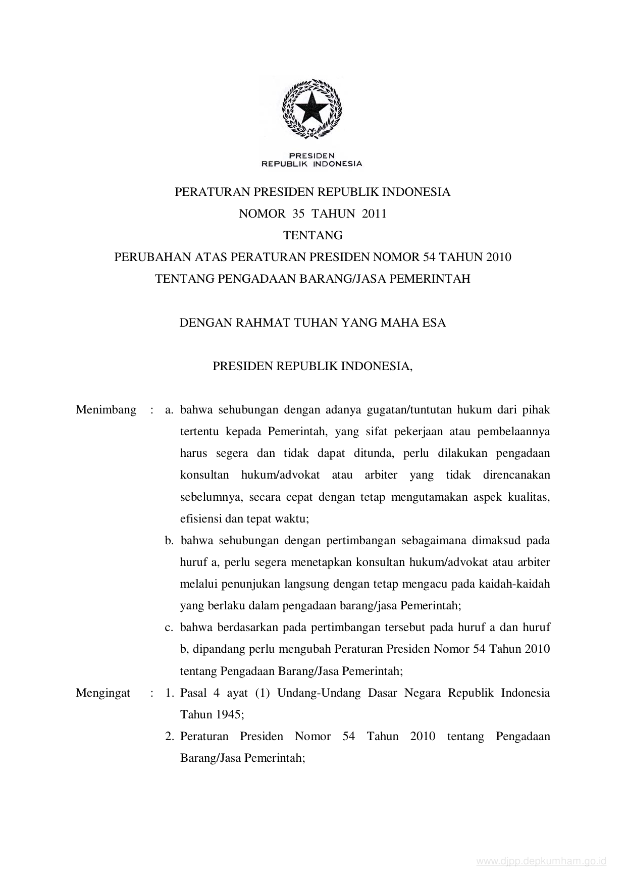 PERPRES Nomor 35 Tahun 2011 | Peraturan Presiden Nomor 35 Tahun 2011 tentang PERUBAHAN ATAS PERATURAN PRESIDEN NOMOR 54 TAHUN 2010 TENTANG PENGADAAN BARANG/JASA PEMERINTAH