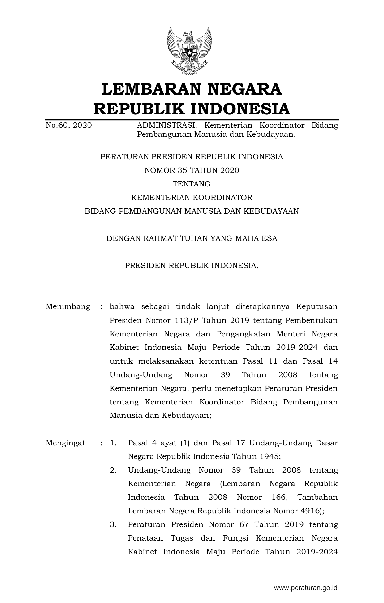 PERPRES Nomor 35 Tahun 2020 | Peraturan Presiden Nomor 35 Tahun 2020 tentang KEMENTERIAN KOORDINATOR BIDANG PEMBANGUNAN MANUSIA DAN KEBUDAYAAN