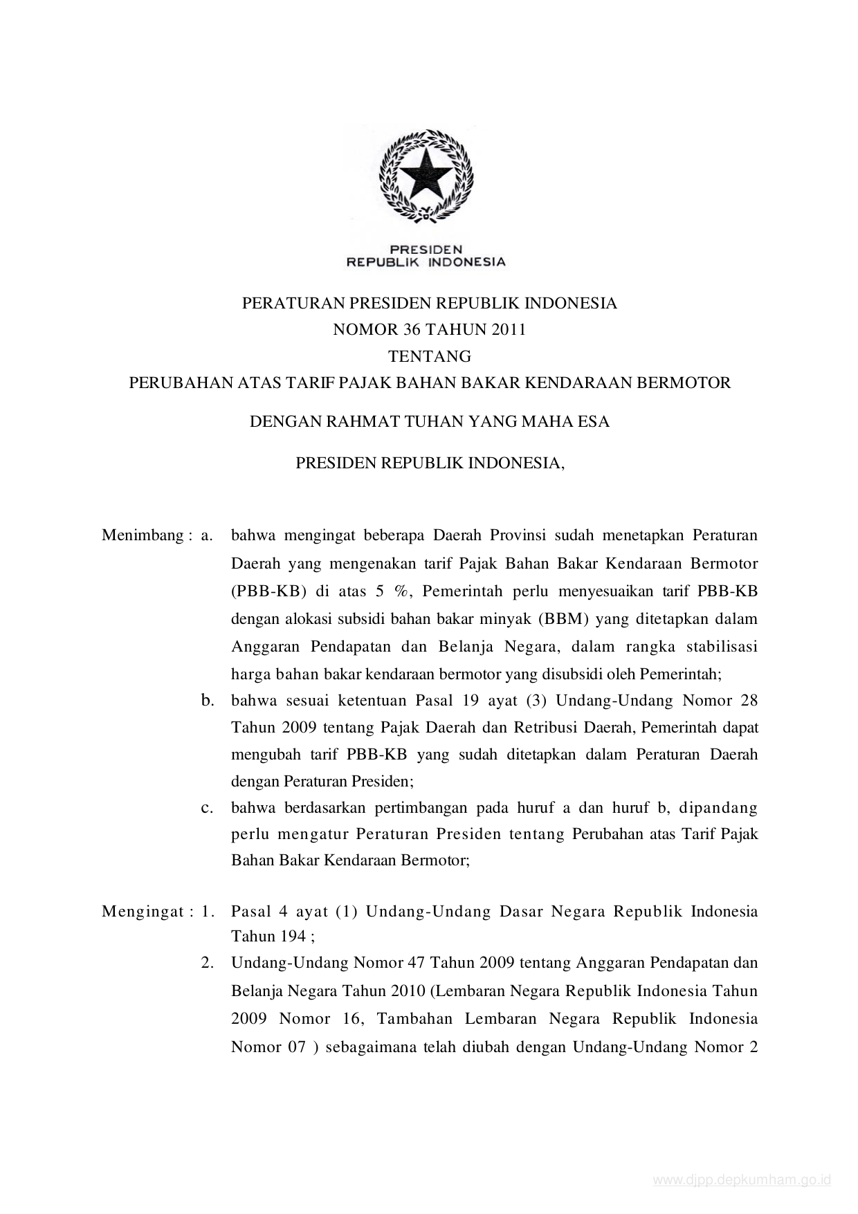 PERPRES Nomor 36 Tahun 2011 | Peraturan Presiden Nomor 36 Tahun 2011 tentang PERUBAHAN ATAS TARIF PAJAK BAHAN BAKAR KENDARAAN BERMOTOR