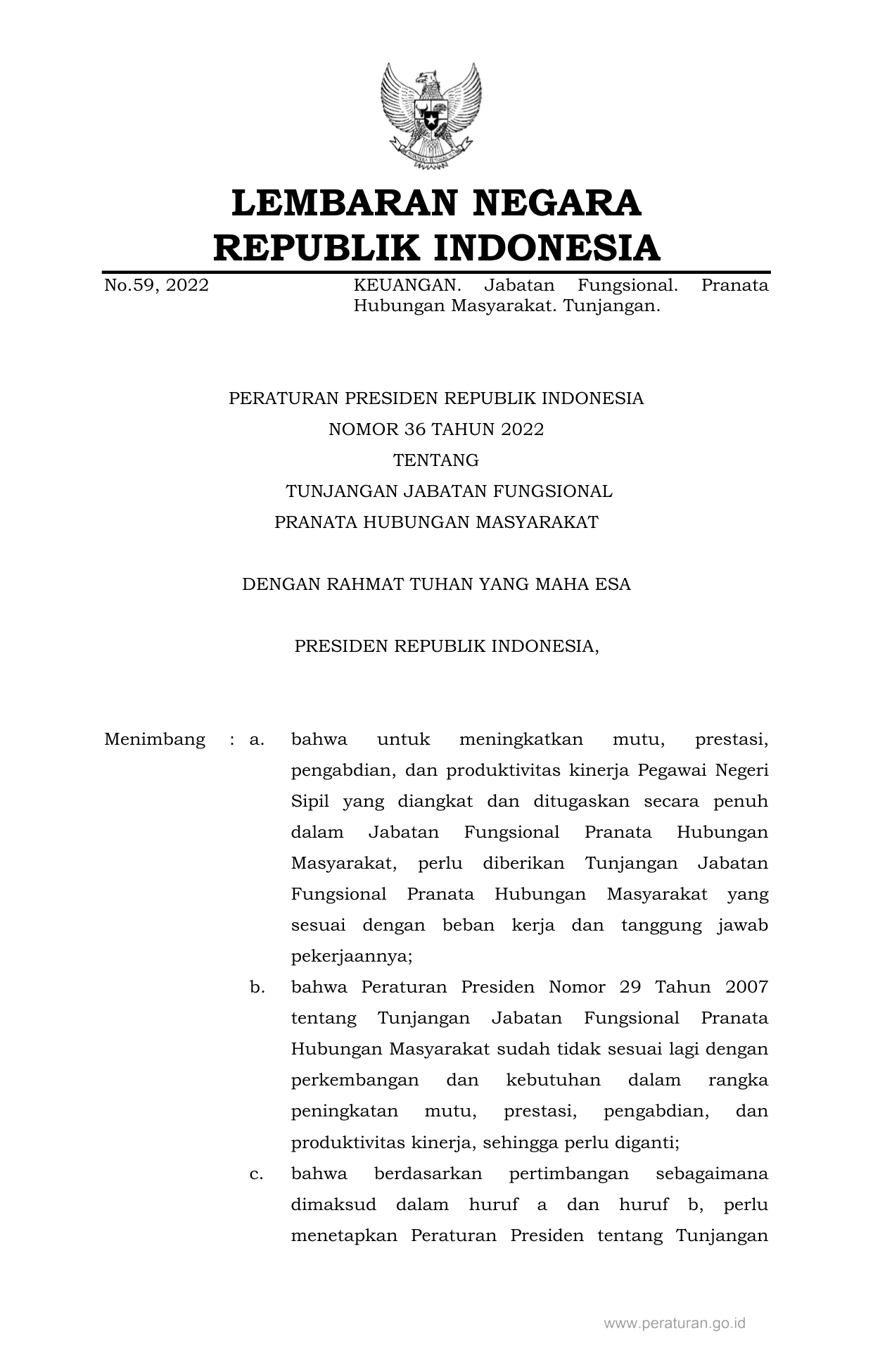 PERPRES Nomor 36 Tahun 2022 | Peraturan Presiden Nomor 36 Tahun 2022 tentang TUNJANGAN JABATAN FUNGSIONAL PRANATA HUBUNGAN MASYARAKAT
