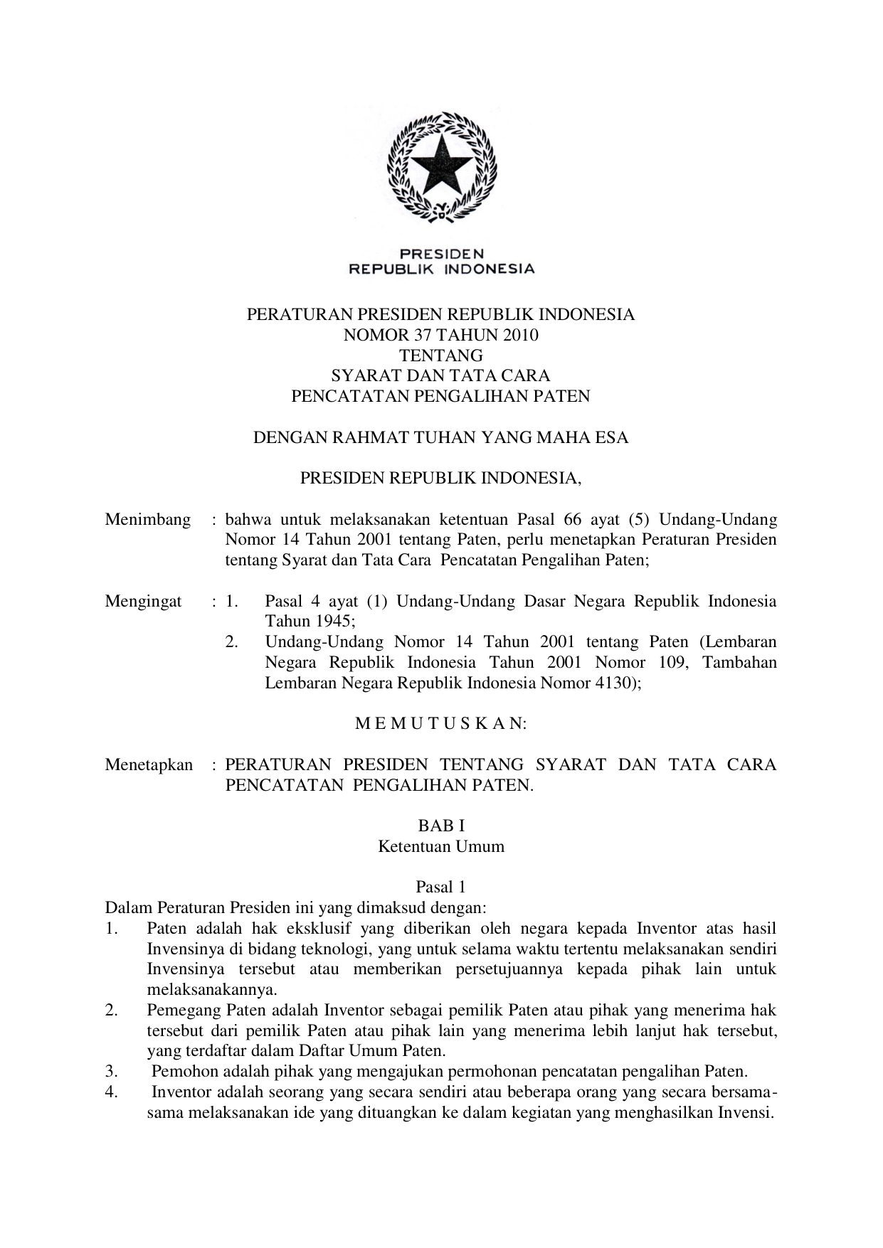PERPRES Nomor 37 Tahun 2010 | Peraturan Presiden Nomor 37 Tahun 2010 tentang SYARAT DAN TATA CARA PENCATATAN PENGALIHAN PATEN