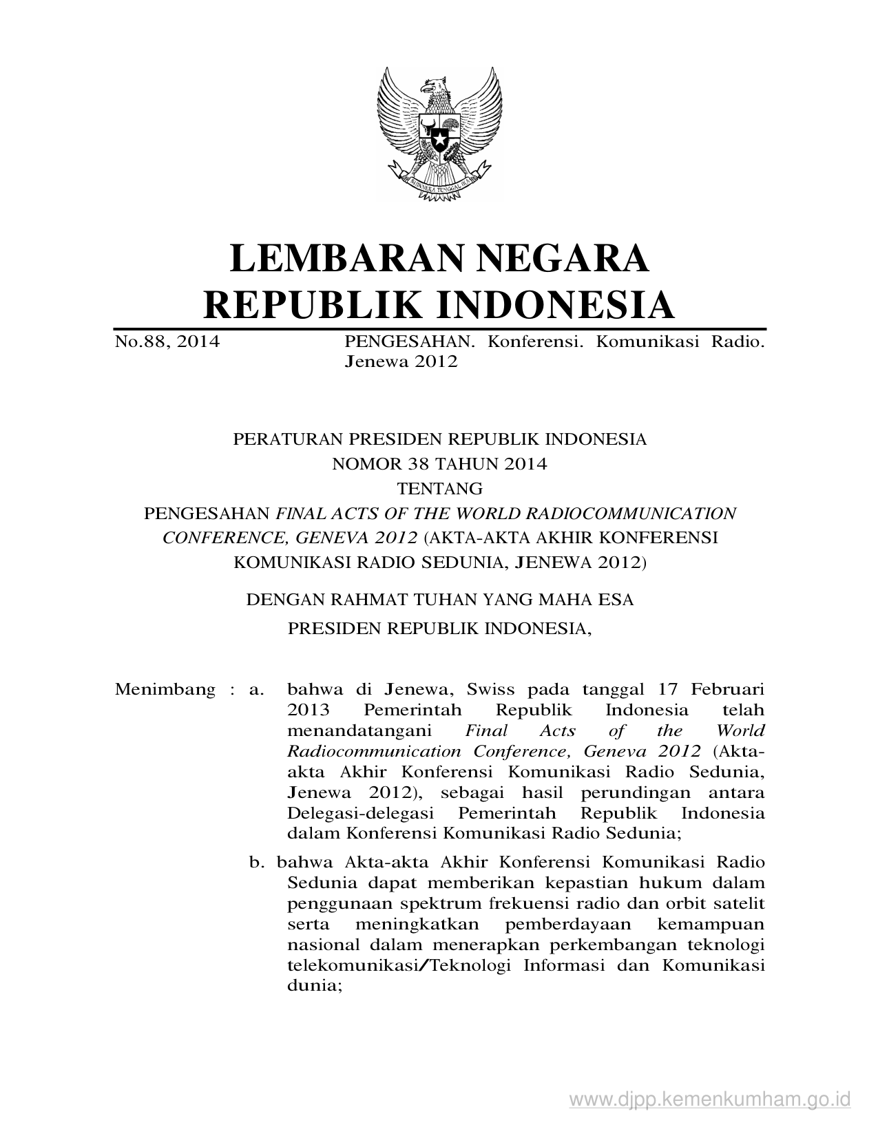 PERPRES Nomor 38 Tahun 2014 | Peraturan Presiden Nomor 38 Tahun 2014 tentang PENGESAHAN FINAL ACTS OF THE WORLD RADIOCOMMUNICATION CONFERENCE, GENEVA 2012 (AKTA-AKTA AKHIR KONFERENSI KOMUNIKASI RADIO SEDUNIA, JENEWA 2012)
