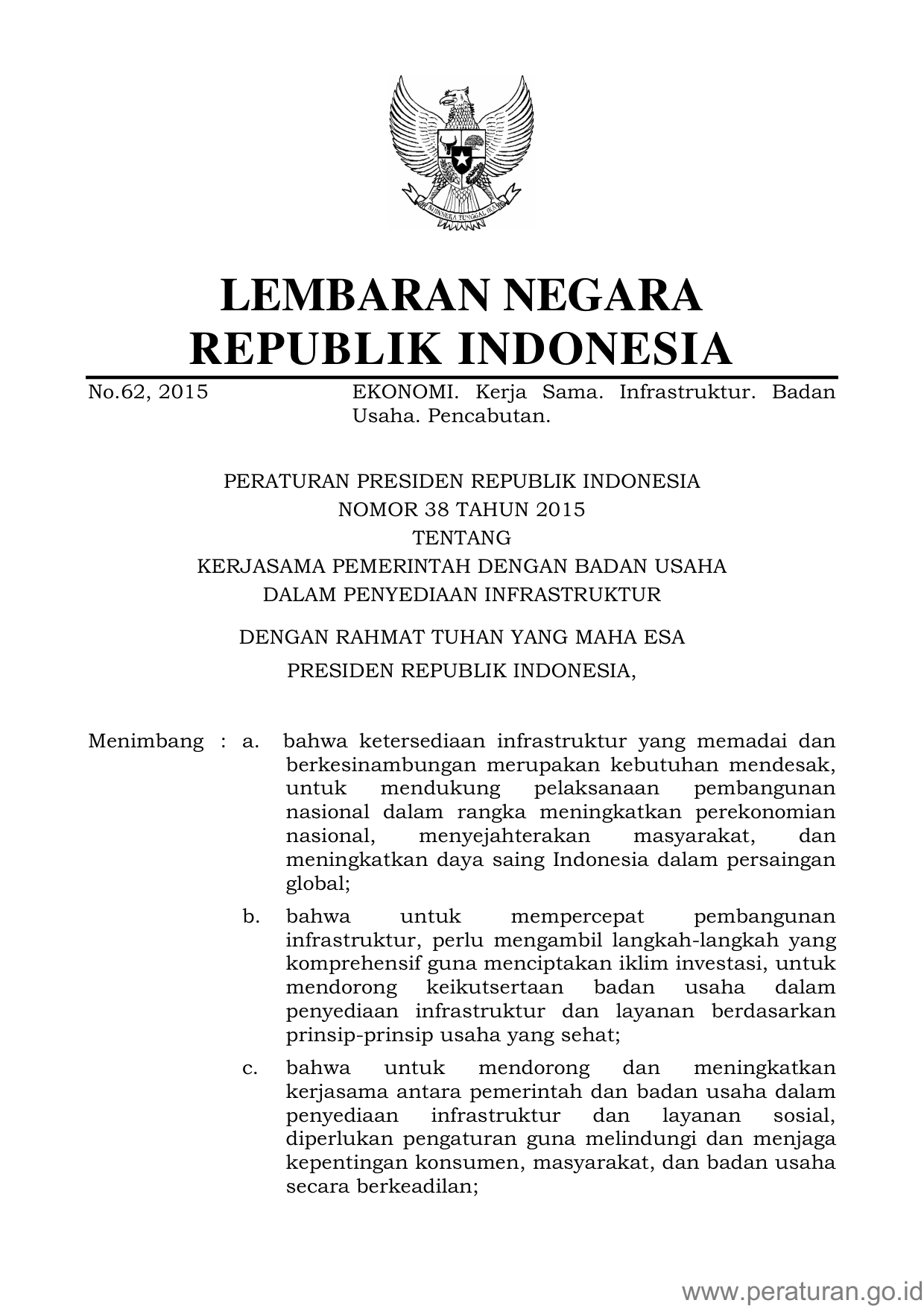 PERPRES Nomor 38 Tahun 2015 | Peraturan Presiden Nomor 38 Tahun 2015 tentang KERJASAMA PEMERINTAH DENGAN BADAN USAHA DALAM PENYEDIAAN INFRASTRUKTUR