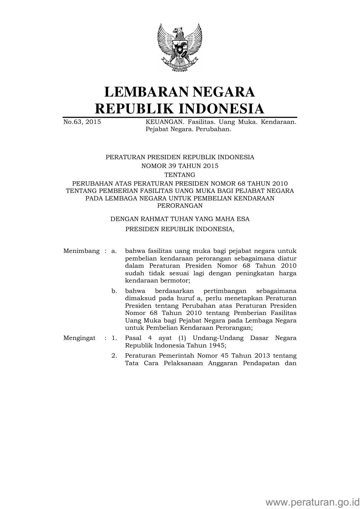 PERPRES Nomor 39 Tahun 2015 | Peraturan Presiden Nomor 39 Tahun 2015 tentang PERUBAHAN ATAS PERATURAN PRESIDEN NOMOR 68 TAHUN 2010 TENTANG PEMBERIAN FASILITAS UANG MUKA BAGI PEJABAT NEGARA PADA LEMBAGA NEGARA UNTUK PEMBELIAN KENDARAAN PERORANGAN