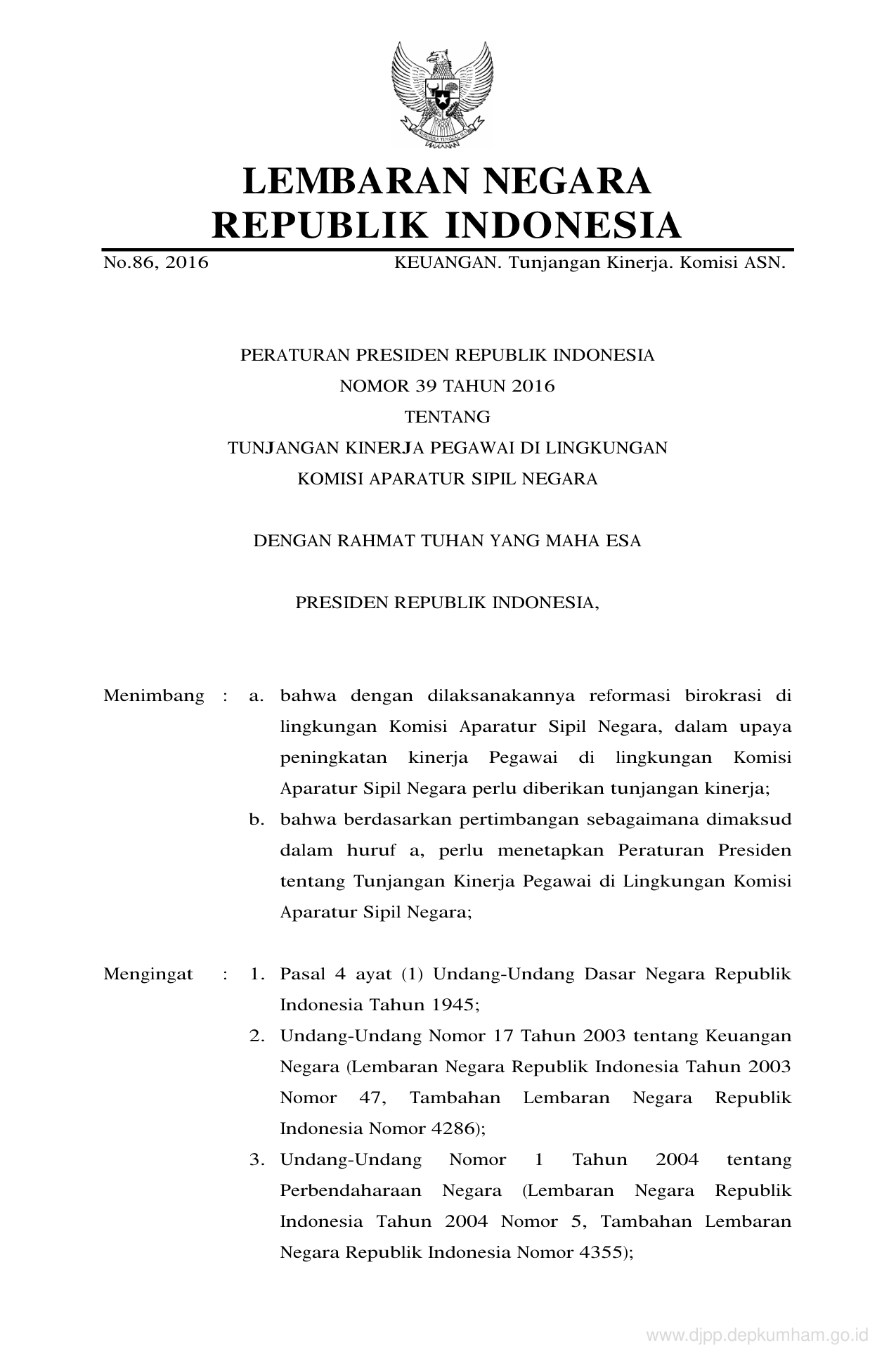 PERPRES Nomor 39 Tahun 2016 | Peraturan Presiden Nomor 39 Tahun 2016 tentang TUNJANGAN KINERJA PEGAWAI DI LINGKUNGAN KOMISI APARATUR SIPIL NEGARA