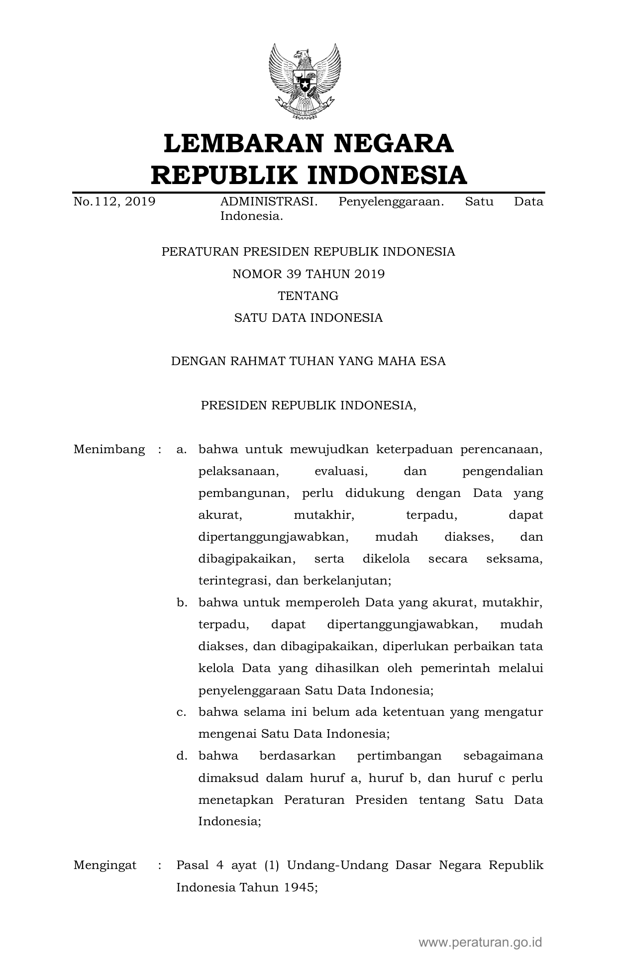 PERPRES Nomor 39 Tahun 2019 | Peraturan Presiden Nomor 39 Tahun 2019 tentang SATU DATA INDONESIA