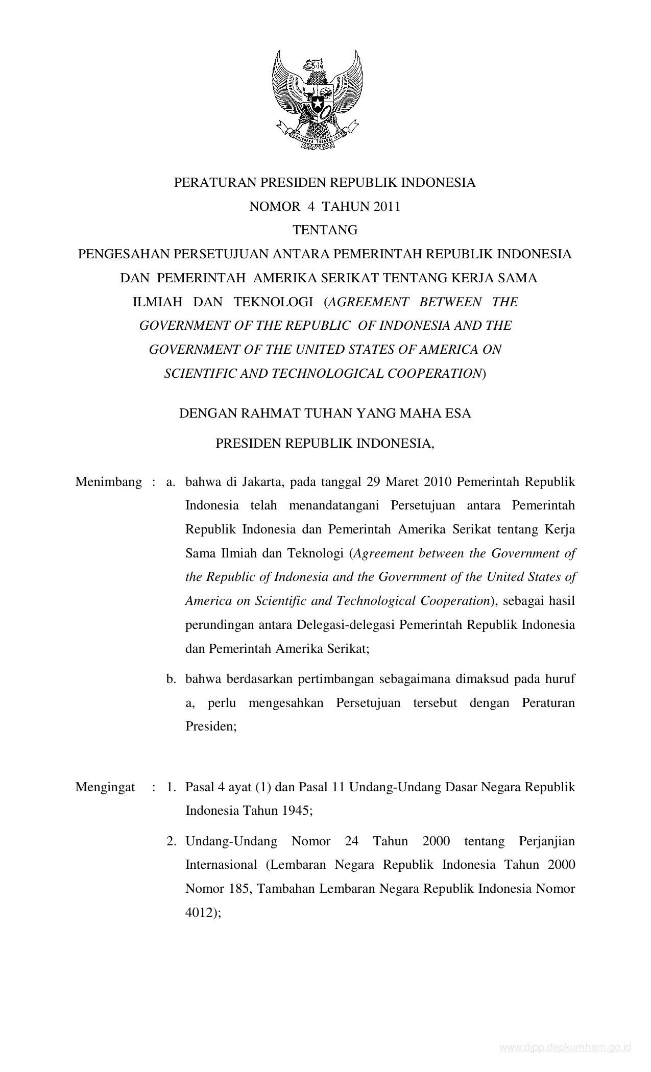 PERPRES Nomor 4 Tahun 2011 | Peraturan Presiden Nomor 4 Tahun 2011 tentang PENGESAHAN PERSETUJUAN ANTARA PEMERINTAH REPUBLIK INDONESIA DAN PEMERINTAH AMERIKA SERIKAT TENTANG KERJA SAMA ILMIAH DAN TEKNOLOGI (AGREEMENT BETWEEN THE GOVERNMENT OF THE REPUBLIC OF INDONESIA AND THE GOVERNMENT OF THE UNITED STATES OF AMERICA ON SCIENTIFIC AND TECHNOLOGICAL COOPERATION)