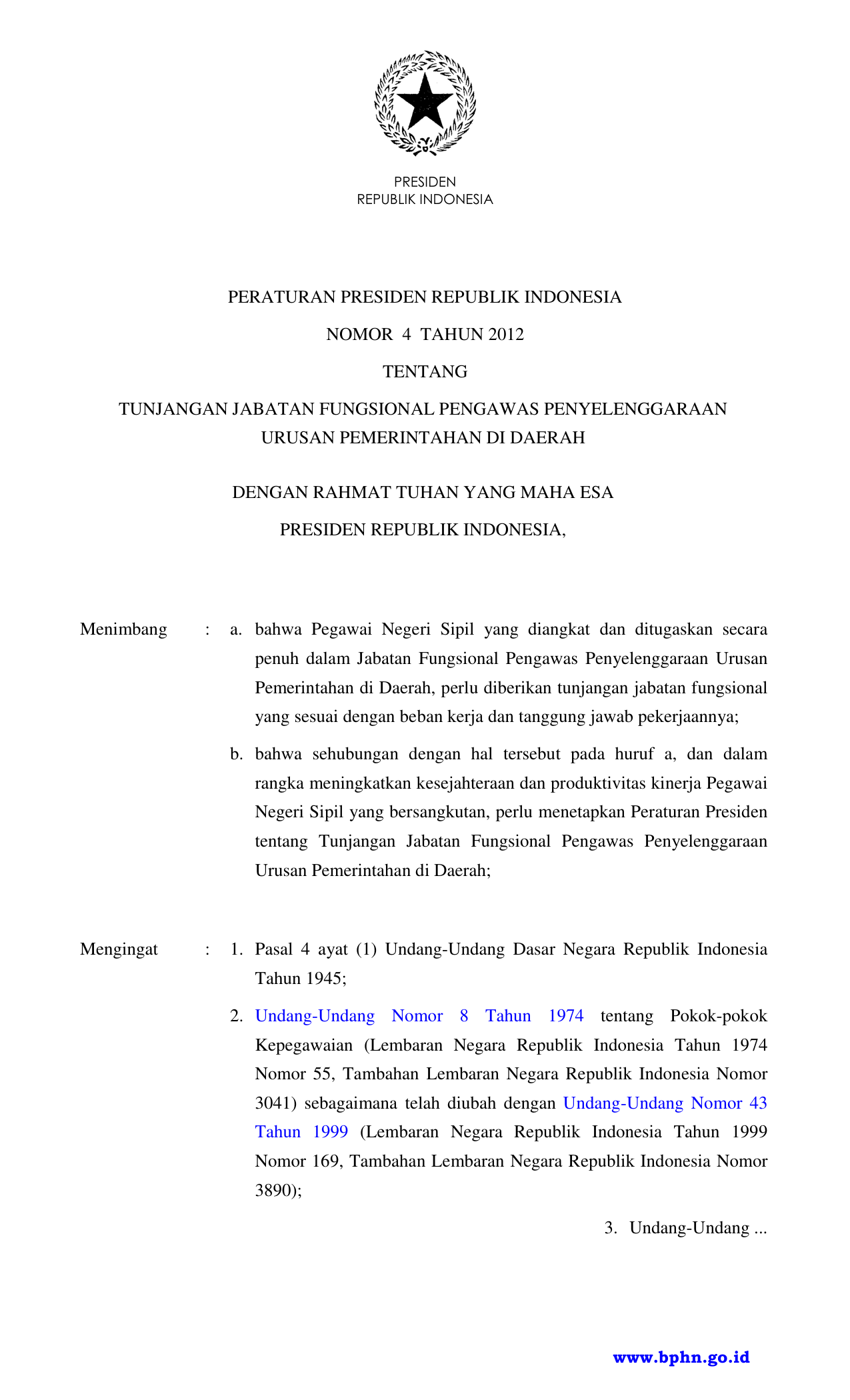 PERPRES Nomor 4 Tahun 2012 | Peraturan Presiden Nomor 4 Tahun 2012 tentang TUNJANGAN JABATAN FUNGSIONAL PENGAWAS PENYELENGGARAAN URUSAN PEMERINTAHAN DI DAERAH