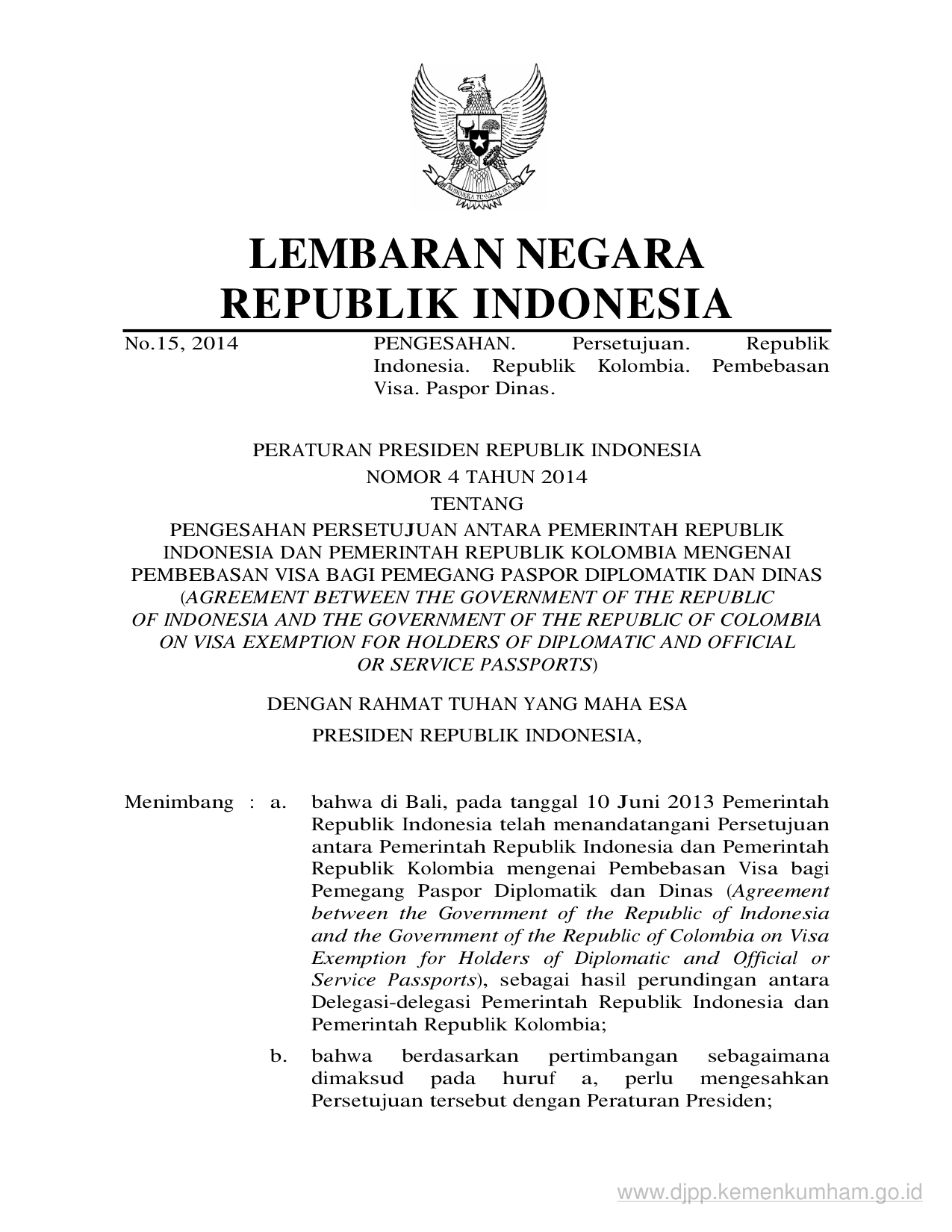 PERPRES Nomor 4 Tahun 2014 | Peraturan Presiden Nomor 4 Tahun 2014 tentang PENGESAHAN PERSETUJUAN ANTARA PEMERINTAH REPUBLIK INDONESIA DAN PEMERINTAH REPUBLIK KOLOMBIA MENGENAI PEMBEBASAN VISA BAGI PEMEGANG PASPOR DIPLOMATIK DAN DINAS (AGREEMENT BETWEEN THE GOVERNMENT OF THE REPUBLIC OF INDONESIA AND THE GOVERNMENT OF THE REPUBLIC OF COLOMBIA ON VISA EXEMPTION FOR HOLDERS OF DIPLOMATIC AND OFFICIAL OR SERVICE PASSPORTS)