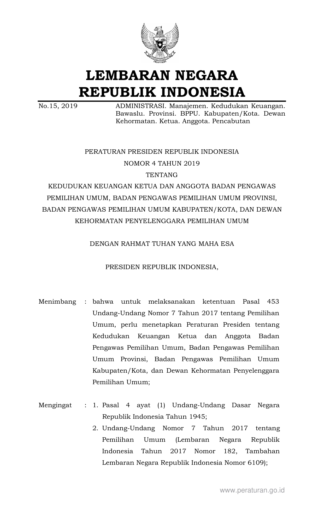 PERPRES Nomor 4 Tahun 2019 | Peraturan Presiden Nomor 4 Tahun 2019 tentang KEDUDUKAN KEUANGAN KETUA DAN ANGGOTA BADAN PENGAWAS PEMILIHAN UMUM, BADAN PENGAWAS PEMILIHAN UMUM PROVINSI, BADAN PENGAWAS PEMILIHAN UMUM KABUPATEN/KOTA, DAN DEWAN KEHORMATAN PENYELENGGARA PEMILIHAN UMUM