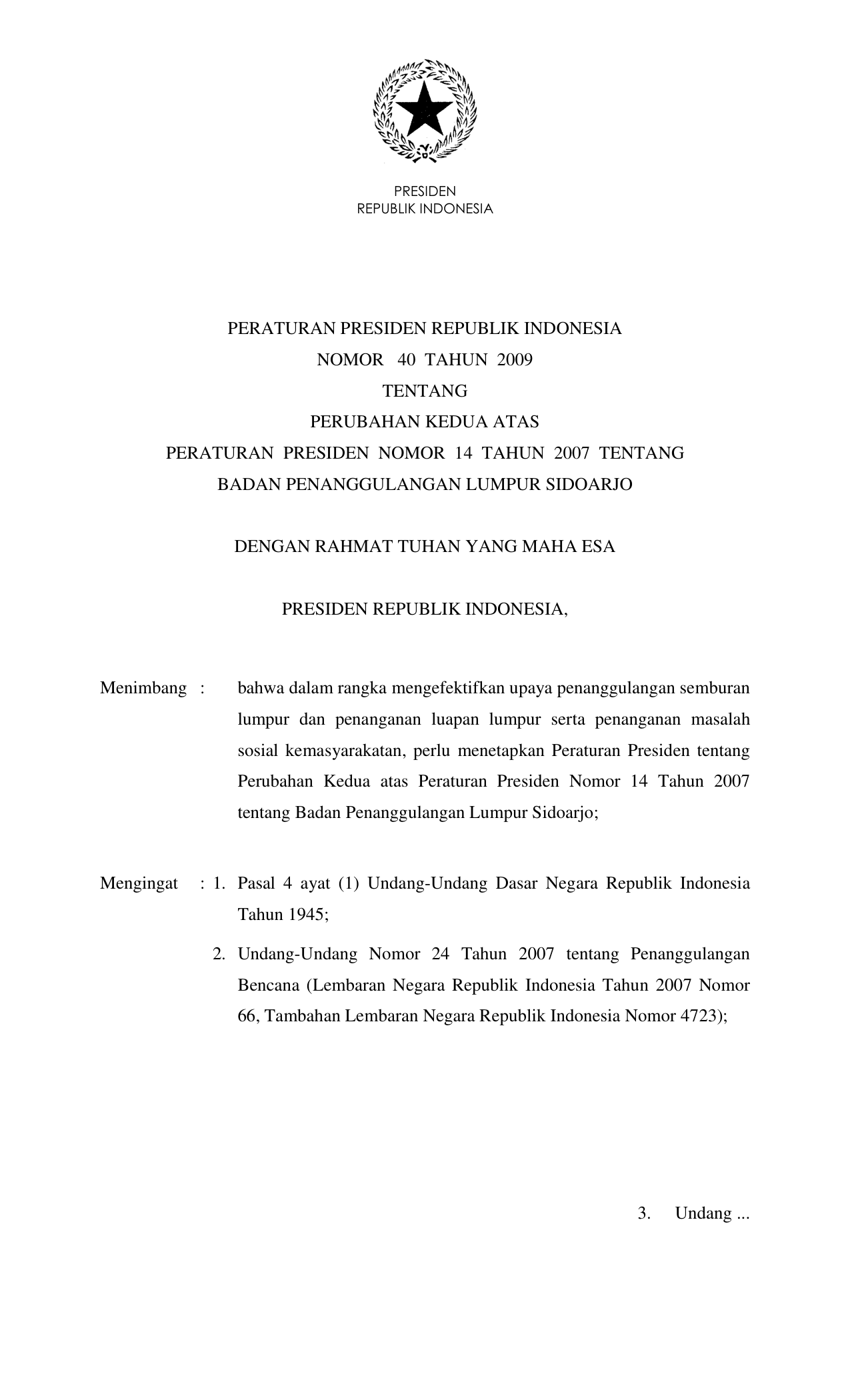 PERPRES Nomor 40 Tahun 2009 | Peraturan Presiden Nomor 40 Tahun 2009 tentang PERUBAHAN KEDUA PERPRES 14-2007 TENTANG BADAN PENANGGULANGAN LUMPUR SIDOARJO