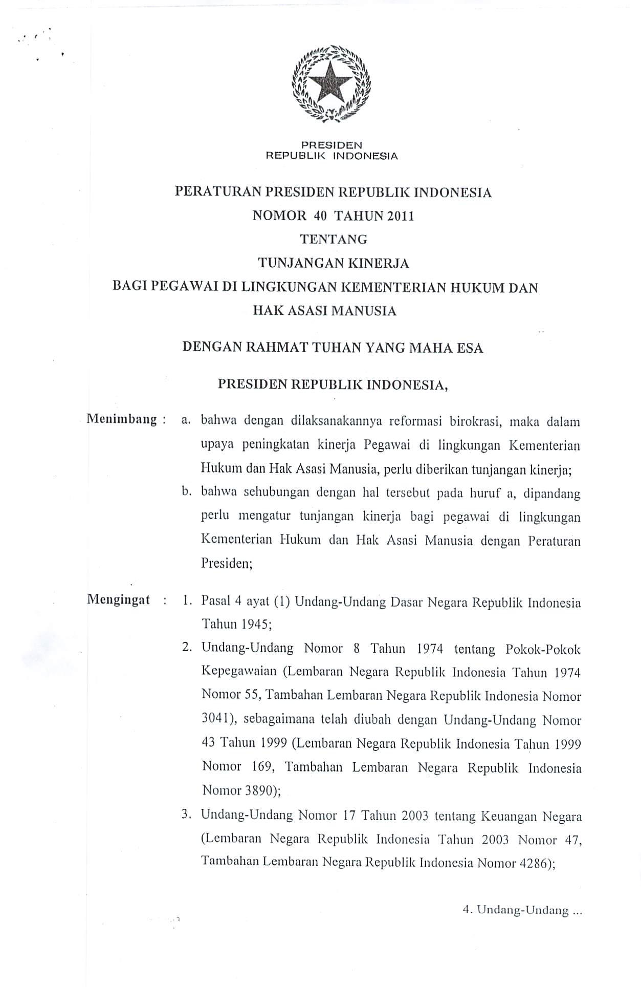 PERPRES Nomor 40 Tahun 2011 | Peraturan Presiden Nomor 40 Tahun 2011 tentang TUNJANGAN KINERJA BAGI PEGAWAI DI LINGKUNGAN KEMENTERIAN HUKUM DAN HAK ASASI MANUSIA