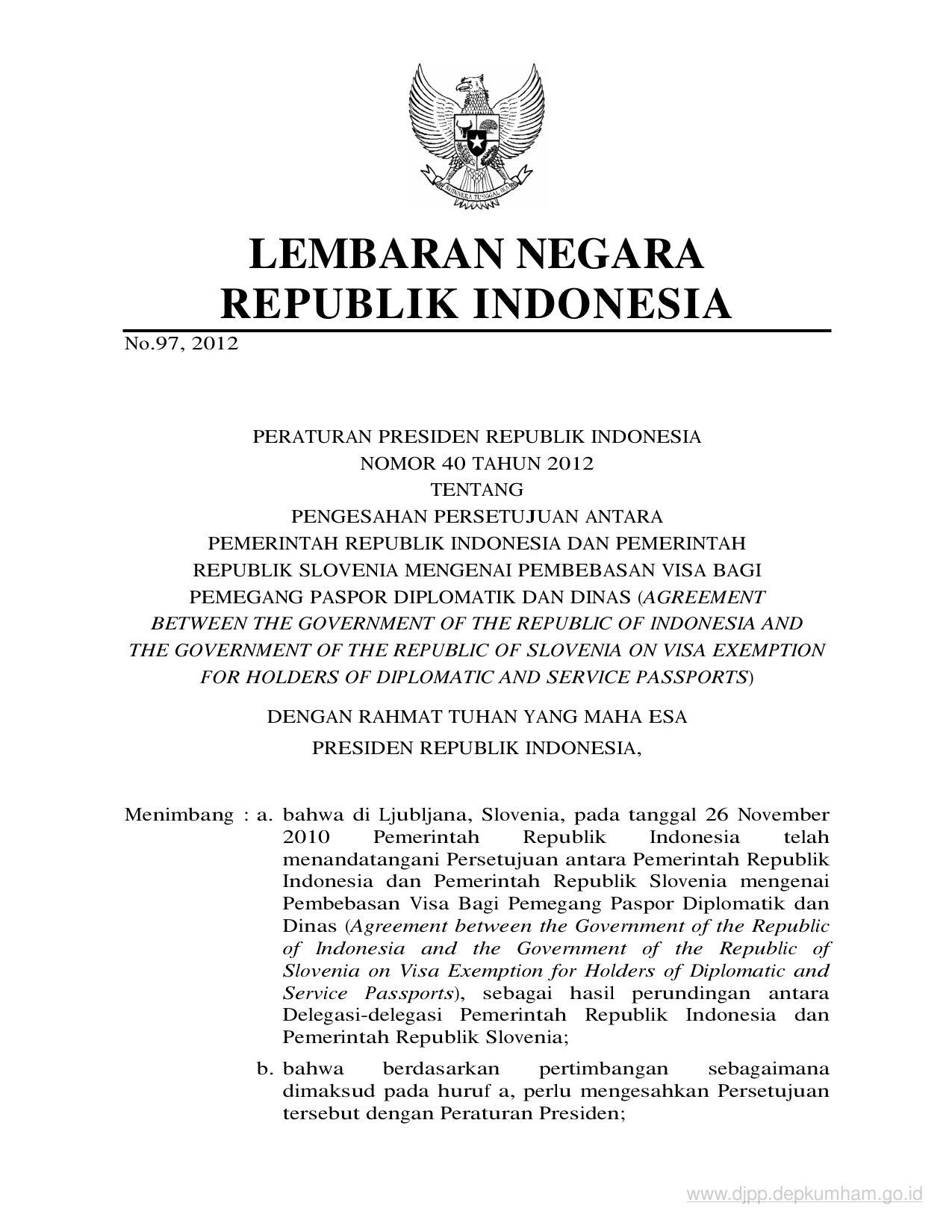 PERPRES Nomor 40 Tahun 2012 | Peraturan Presiden Nomor 40 Tahun 2012 tentang PENGESAHAN PERSETUJUAN ANTARA PEMERINTAH REPUBLIK INDONESIA DAN PEMERINTAH REPUBLIK SLOVENIA MENGENAI PEMBEBASAN VISA BAGI PEMEGANG PASPOR DIPLOMATIK DAN DINAS (AGREEMENT BETWEEN THE GOVERNMENT OF THE REPUBLIC OF INDONESIA AND THE GOVERNMENT OF THE REPUBLIC OF SLOVENIA ON VISA EXEMPTION FOR HOLDERS OF DIPLOMATIC AND SERVICE PASSPORTS)