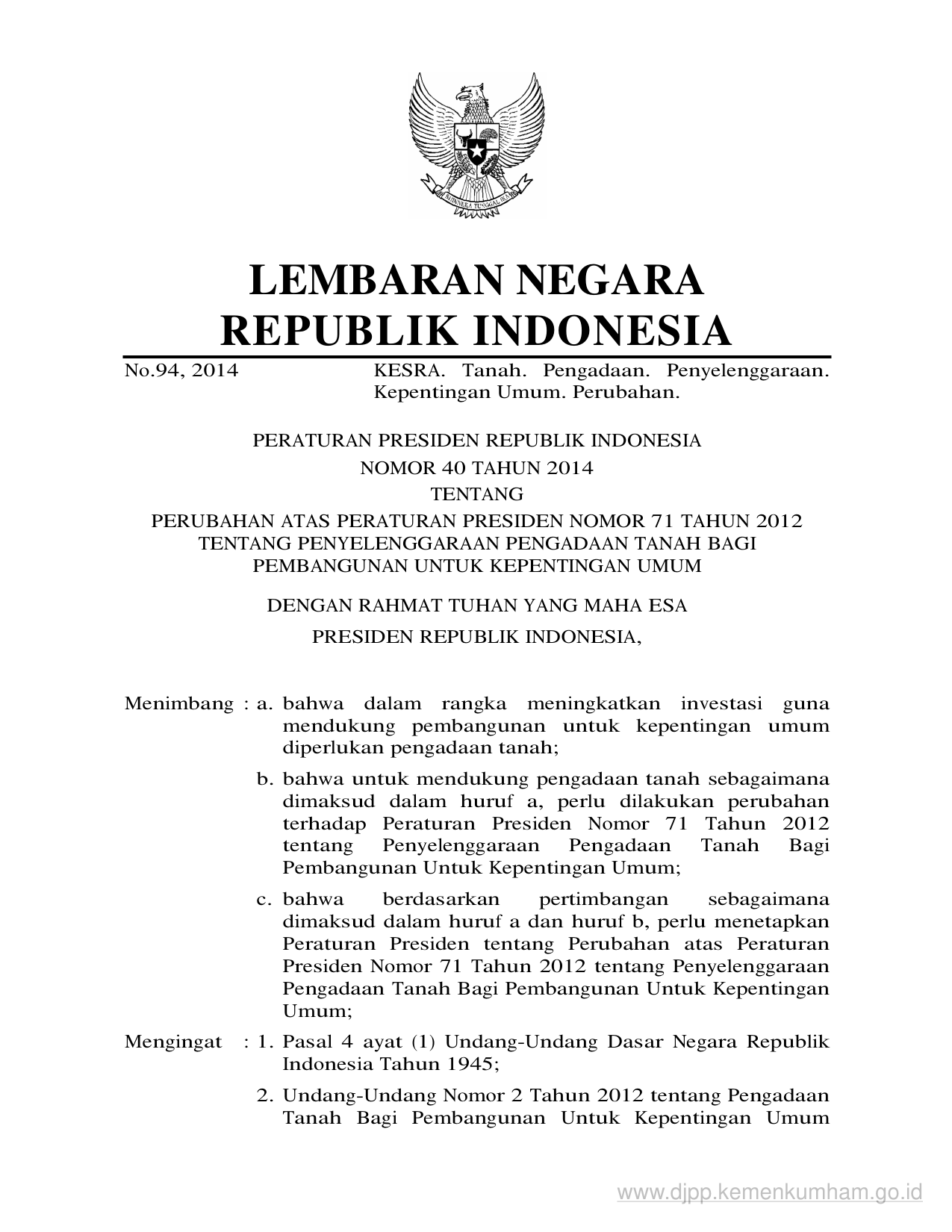 PERPRES Nomor 40 Tahun 2014 | Peraturan Presiden Nomor 40 Tahun 2014 tentang PERUBAHAN ATAS PERATURAN PRESIDEN NOMOR 71 TAHUN 2012 TENTANG PENYELENGGARAAN PENGADAAN TANAH BAGI PEMBANGUNAN UNTUK KEPENTINGAN UMUM
