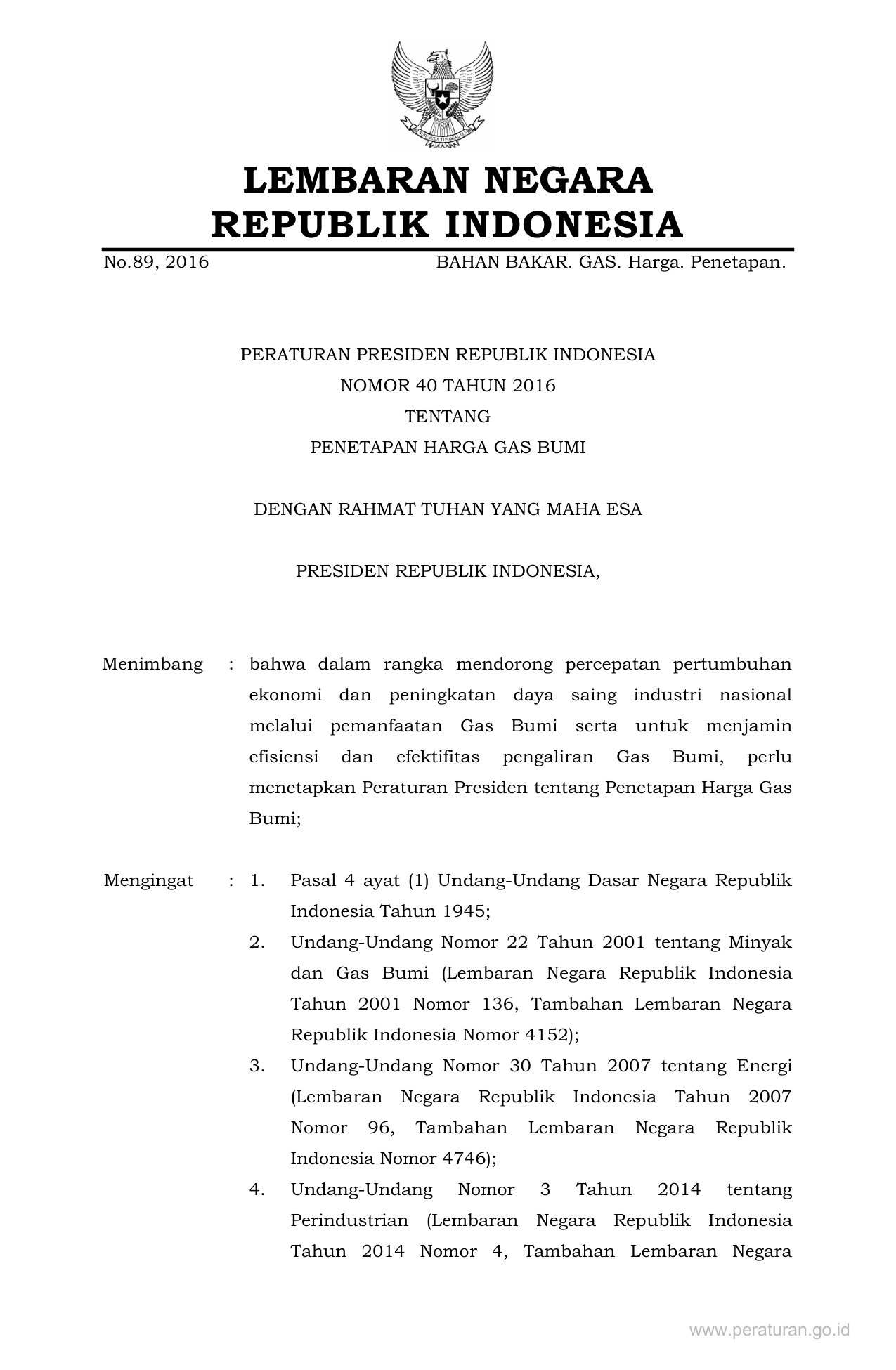 PERPRES Nomor 40 Tahun 2016 | Peraturan Presiden Nomor 40 Tahun 2016 tentang Penetapan Harga Gas Bumi