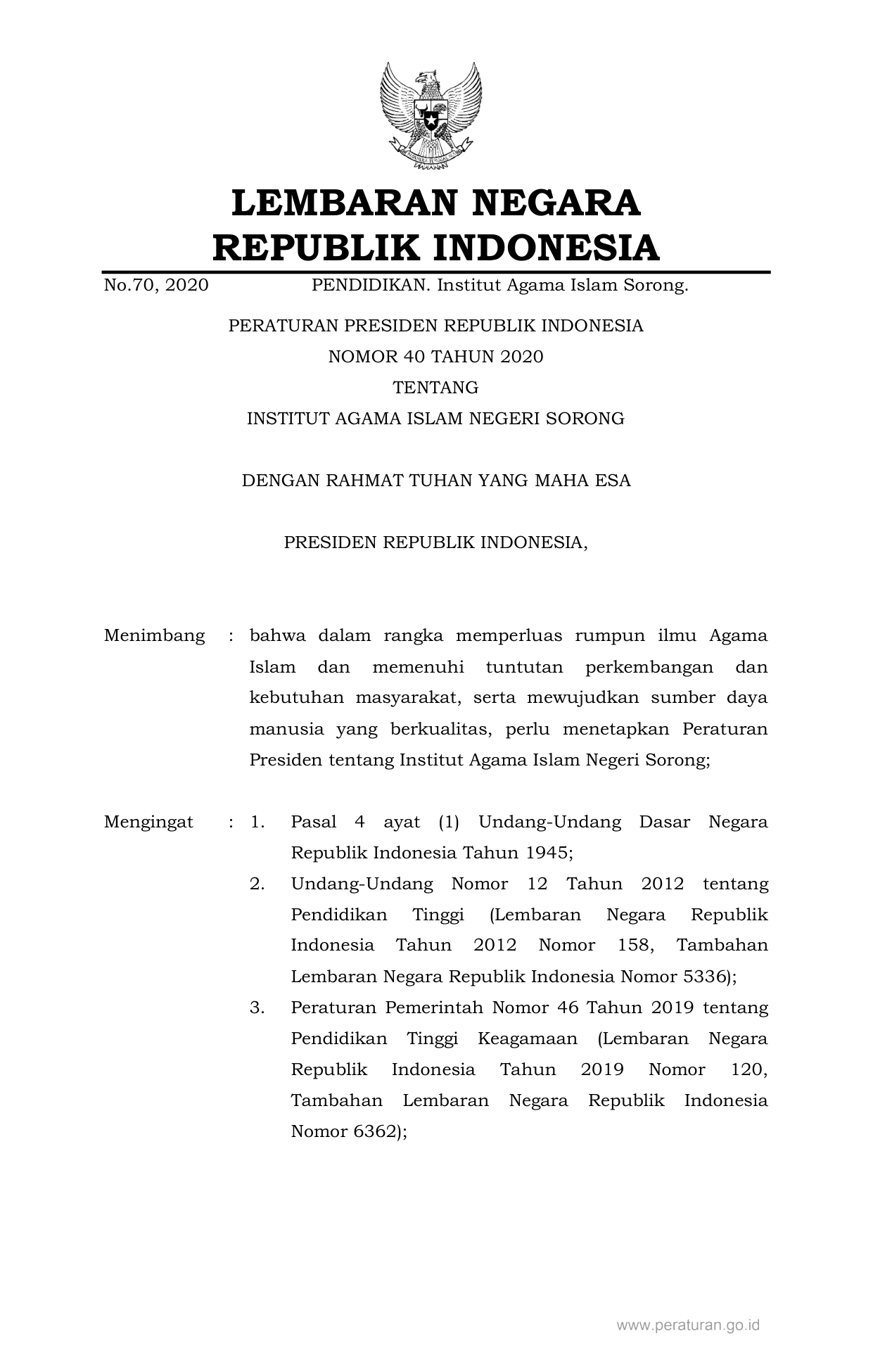 PERPRES Nomor 40 Tahun 2020 | Peraturan Presiden Nomor 40 Tahun 2020 tentang INSTITUT AGAMA ISLAM NEGERI SORONG