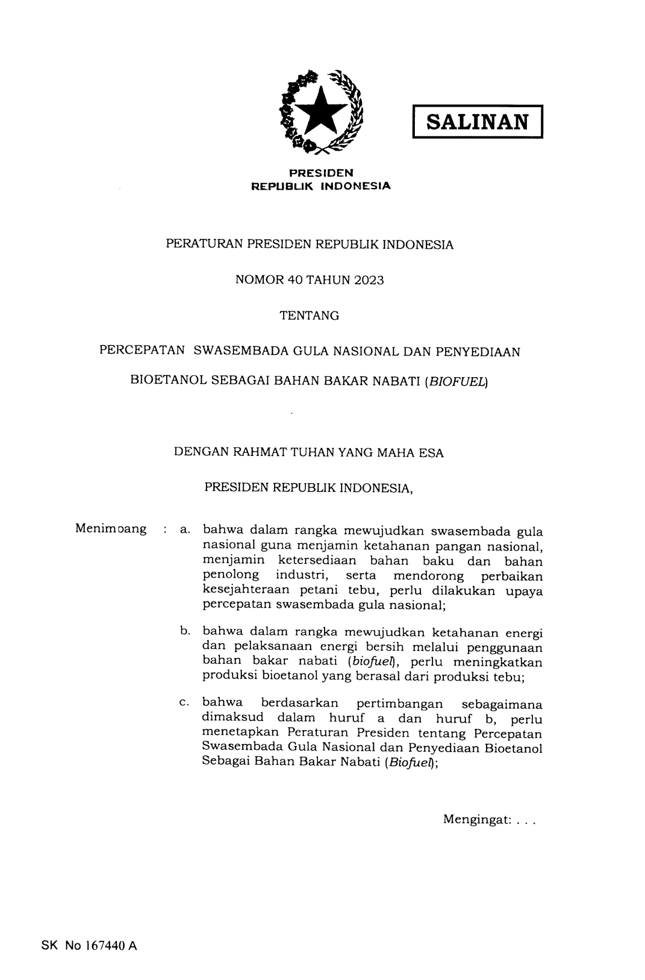PERPRES Nomor 40 Tahun 2023 | Peraturan Presiden Nomor 40 Tahun 2023 tentang PEITCEPATAN SWASEMBADA GULA NASIONAL DAN PENYEDIAANBIOETANOL SEBAGAI BAHAN BAKAR NABATI (BIOFUDLI