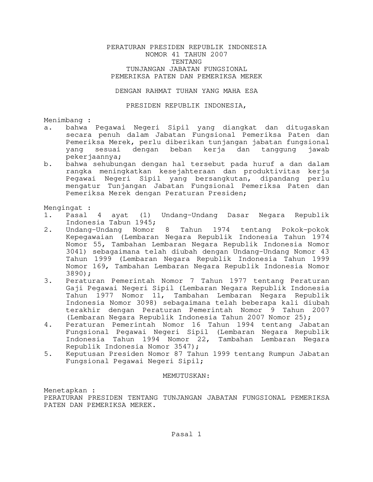 PERPRES Nomor 41 Tahun 2007 | Peraturan Presiden Nomor 41 Tahun 2007 tentang TUNJANGAN JABATAN FUNGSIONAL PEMERIKSA PATEN DAN PEMERIKSA MEREK