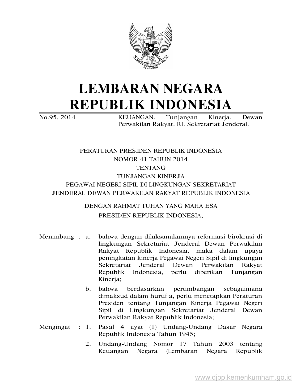 PERPRES Nomor 41 Tahun 2014 | Peraturan Presiden Nomor 41 Tahun 2014 tentang TUNJANGAN KINERJA PEGAWAI NEGERI SIPIL DI LINGKUNGAN SEKRETARIAT JENDERAL DEWAN PERWAKILAN RAKYAT REPUBLIK INDONESIA